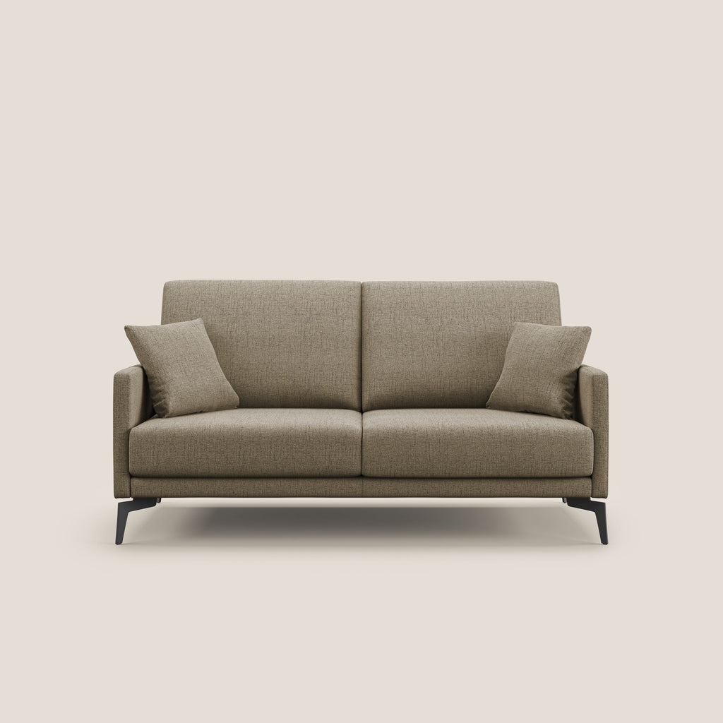Il divano è un elegante e confortevole divano composto da un modulo da 3 posti e uno da 2 posti. Realizzato in morbido tessuto impermeabile, presenta piedini in acciaio nero, alti 17 cm. Questo divano si distingue per essere completamente sfoderabile, offrendo la possibilità di scegliere tra 11 diversi colori e varie misure per adattarsi ad ogni spazio e stile di arredamento. Realizzato al 100% in Italia, questo divano è impreziosito dalla manifattura artigianale, che si riflette nella selezione di materiali di alta qualità, nel tessuto water-repellent facilmente lavabile, nella ribattitura del tessuto cucito e nella sfoderabilità totale che semplifica la sua manutenzione. Inoltre, la seduta e lo schienale presentano un'alta densità di materiali indeformabili, garantendo un comfort duraturo. Il modello è la scelta ideale per chi cerca un divano di qualità, dal design raffinato e made in Italy.