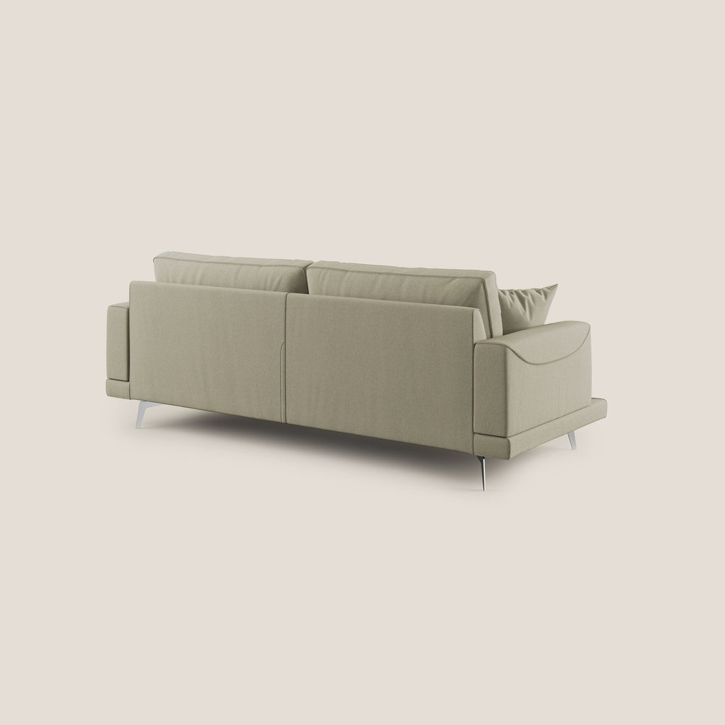 Il divano è un'opera unica nel suo design, con volumi leggeri che vengono esaltati dalla sua struttura in abete e dai cuscini dello schienale in piuma d'oca. Ogni dettaglio di questo divano è rifinito con cura, e questo si riflette nella sua qualità. Disponibile in un'ampia scelta di colori e misure, il divano si adatta a ogni ambiente.Questo divano offre anche praticità e comfort, essendo completamente sfoderabile e dotato di una doppia lavorazione sartoriale che ne evidenzia l'eccellenza dell'artigianato italiano. Il bracciolo con profilo a onda aggiunge un tocco di dolcezza alla linea moderna del salotto, mentre i piedini alti 18 cm in acciaio cromato conferiscono leggerezza al divano e facilitano la sua pulizia. In sintesi, il divano unisce estetica e funzionalità in modo impeccabile.