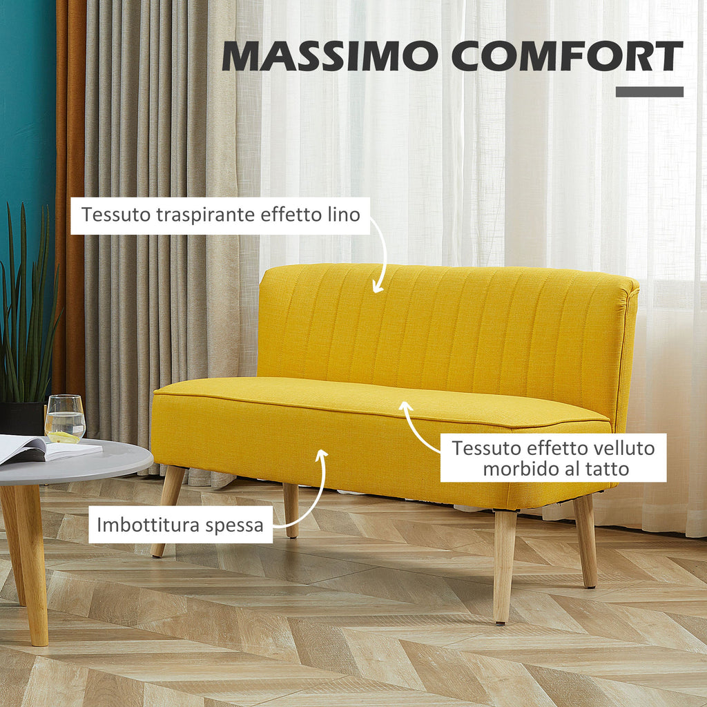 Divano 2 Posti Design Minimal Senza Braccioli in Tessuto con Gambe in Legno 117x56,5x77 cm Giallo