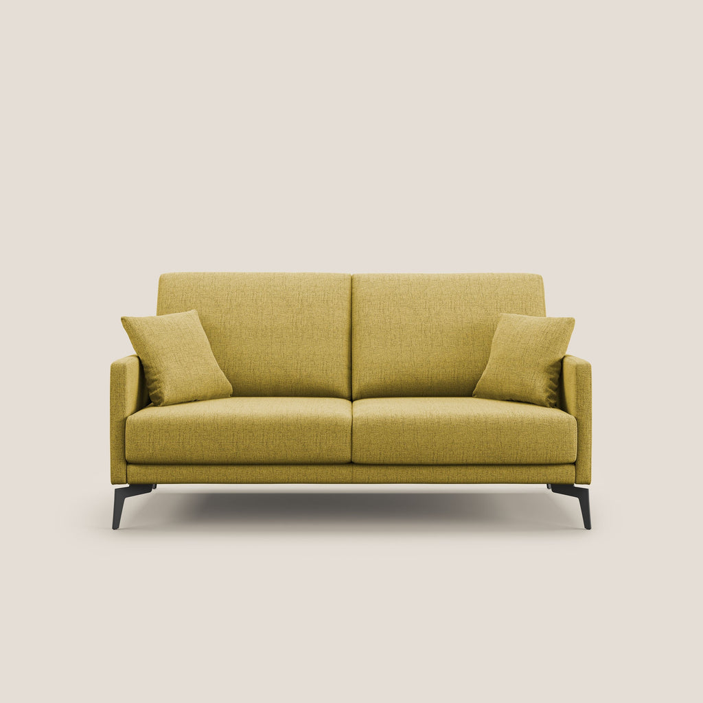 Il divano è disponibile in tessuto morbido ed impermeabile, con piedini in acciaio nero alti 17 cm. È completamente sfoderabile e può essere scelto tra 11 colori e diverse misure per adattarsi a ogni esigenza di spazio e design. Questo divano, 100% made in Italy, è caratterizzato dalla ricercata manifattura artigianale italiana che si manifesta nella selezione accurata di materiali di qualità rispettosi dell'ambiente, nel tessuto water-repellent facile da pulire e lavabile in lavatrice a 30°, nella ribattitura del tessuto cucito che esalta il pregio della lavorazione sartoriale, nella facile sfoderabilità totale e nell'alta densità dei materiali della seduta e dello schienale in HR indeformabile. Il modello offre tutto questo.