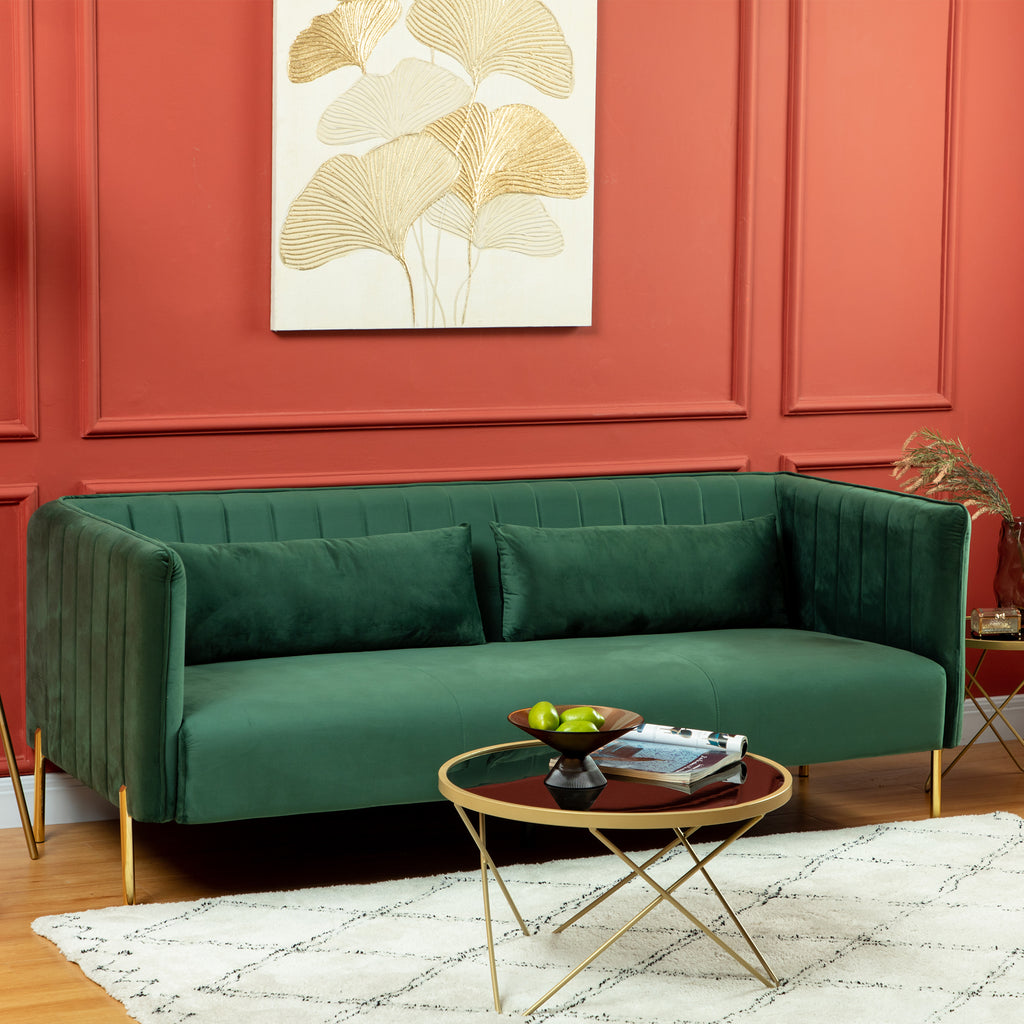 - DÉCORATION ÉLÉGANTE : Apportez une touche d'élégance à l'intérieur de votre intérieur avec ce canapé vert, grâce au tissu raffiné effet velours et aux pieds en acier doré. Un complément classique capable de s'adapter à de nombreux styles