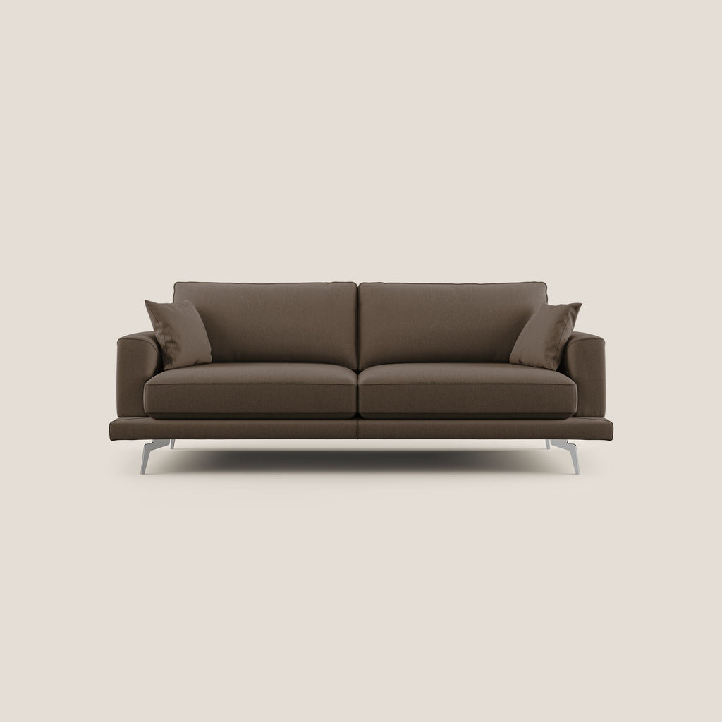 Il divano è caratterizzato da un design unico e ricercato, con volumi leggeri che sono esaltati dalla struttura in ABETE e dai cuscini dello schienale in vera PIUMA D'OCA. La cura per i dettagli è evidente in ogni particolare, rendendo questo divano un pezzo d'arredamento davvero pregiato. Disponibile in 12 colori e diverse misure, è completamente sfoderabile e presenta una doppia lavorazione sartoriale che ne enfatizza la qualità della manifattura italiana. Il bracciolo con profilo a onda contribuisce a addolcire la linea moderna del salotto, mentre i piedini alti 18cm in acciaio cromato conferiscono leggerezza e facilitano la pulizia.