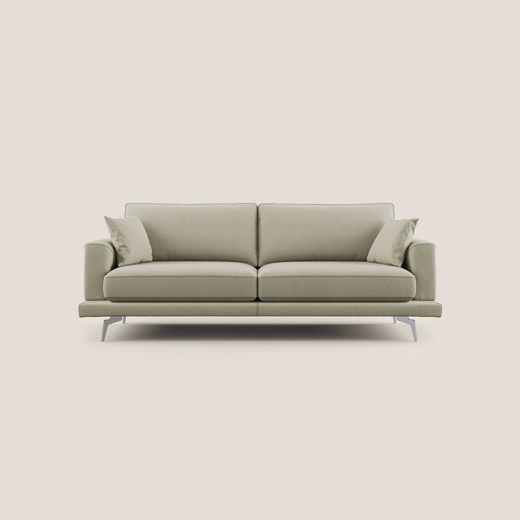Il divano è caratterizzato da un design unico e ricercato, con volumi leggeri che sono esaltati dalla struttura in ABETE e dai cuscini dello schienale in vera PIUMA D'OCA. La cura per i dettagli è evidente in ogni particolare, rendendo questo divano un pezzo d'arredamento davvero pregiato. Disponibile in 12 colori e diverse misure, è completamente sfoderabile e presenta una doppia lavorazione sartoriale che ne enfatizza la qualità della manifattura italiana. Il bracciolo con profilo a onda contribuisce a addolcire la linea moderna del salotto, mentre i piedini alti 18cm in acciaio cromato conferiscono leggerezza e facilitano la pulizia.