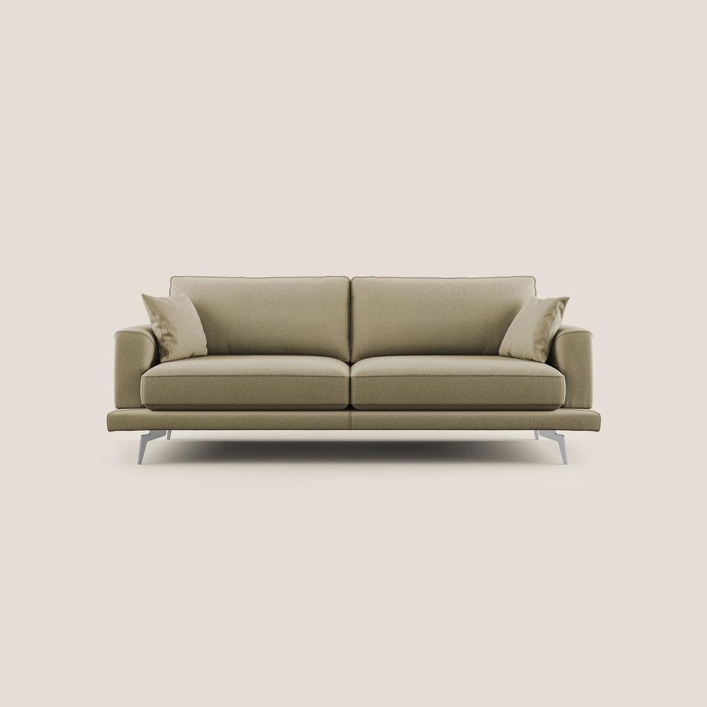 Il divano è un pezzo dal design unico e raffinato, caratterizzato da volumi leggeri che mettono in risalto la sua struttura in abete e i cuscini dello schienale in vera piuma d'oca. Ogni dettaglio è curato con attenzione, rendendo il divano un vero capolavoro artigianale italiano. Disponibile in 12 diverse tonalità e misure, il divano è completamente sfoderabile e presenta una doppia lavorazione sartoriale che ne esalta la qualità della manifattura. Il bracciolo con profilo a onda addolcisce la linea moderna del salotto, mentre i piedini alti in acciaio cromato conferiscono una sensazione di leggerezza e facilitano la pulizia.