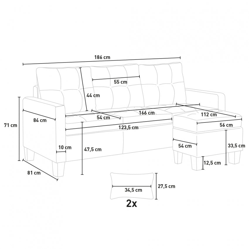 - Dimensions du canapé : 186 x 138 x 91,5 cm (largeur, profondeur, hauteur)