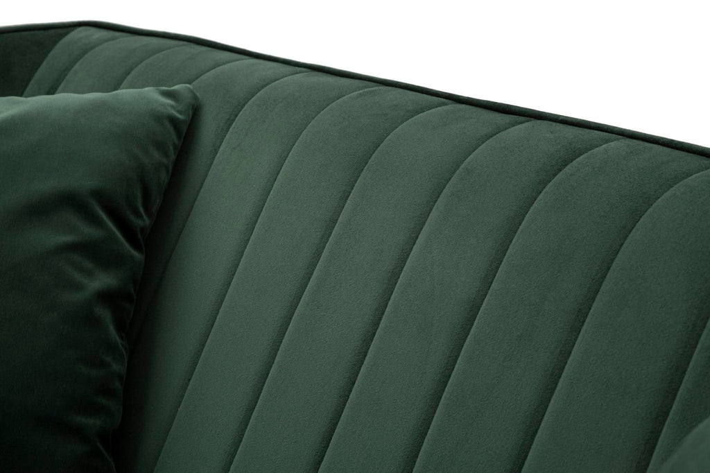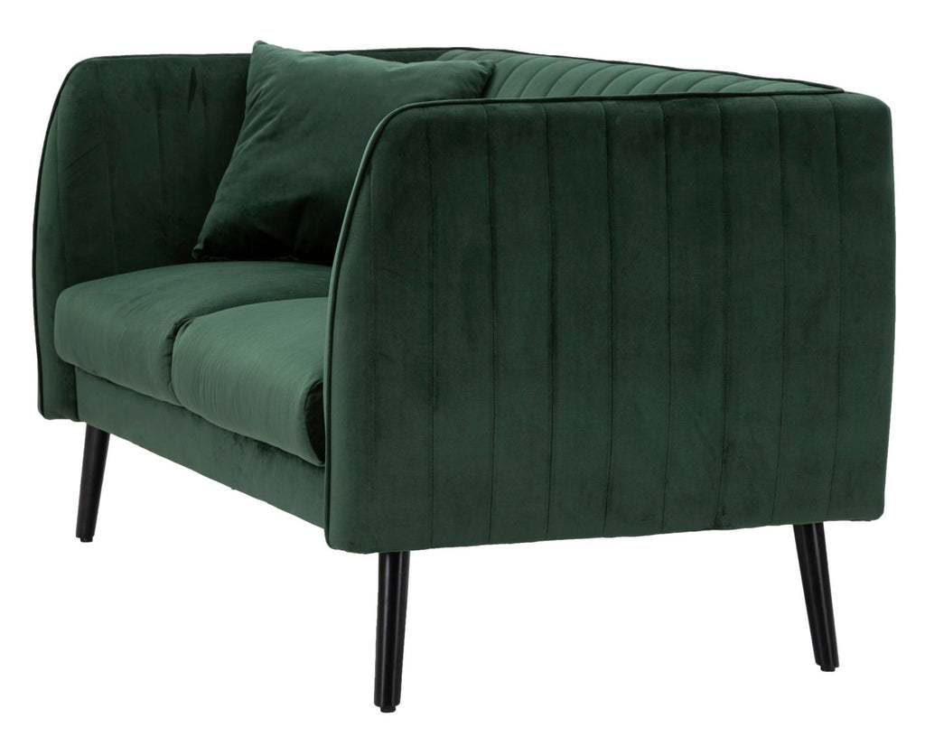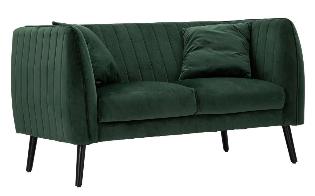 Canapé 2 places en velours vert avec pieds en bois complet de 2 coussins. Des sièges majestueux aux contours arrondis agrémentés de l'élégance du velours. Une touche de classe au goût légèrement rétro.