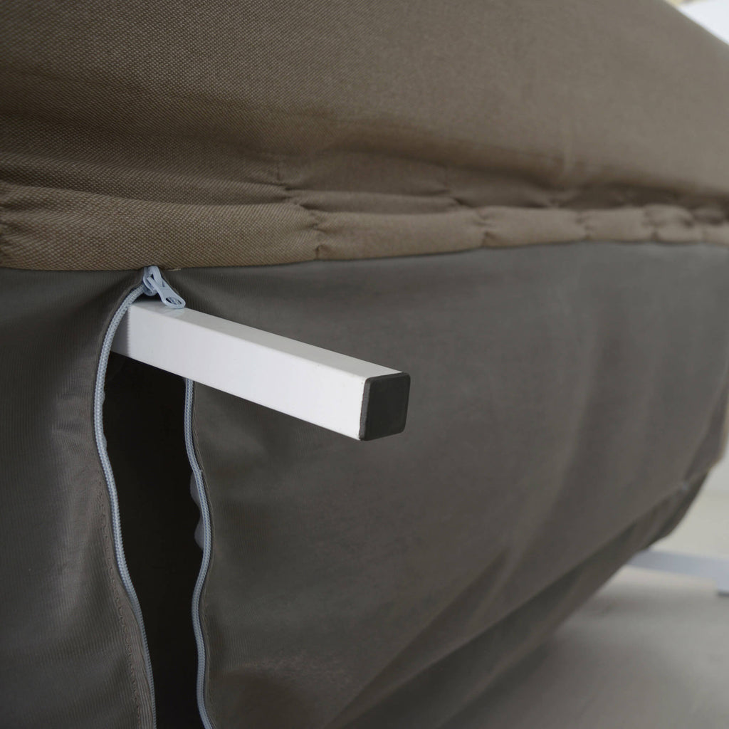- Les pieds de support du lit sont escamotables (une paire incorporée à la partie du matelas faisant office de dossier et une autre paire incorporée à la partie du matelas faisant office d'assise)