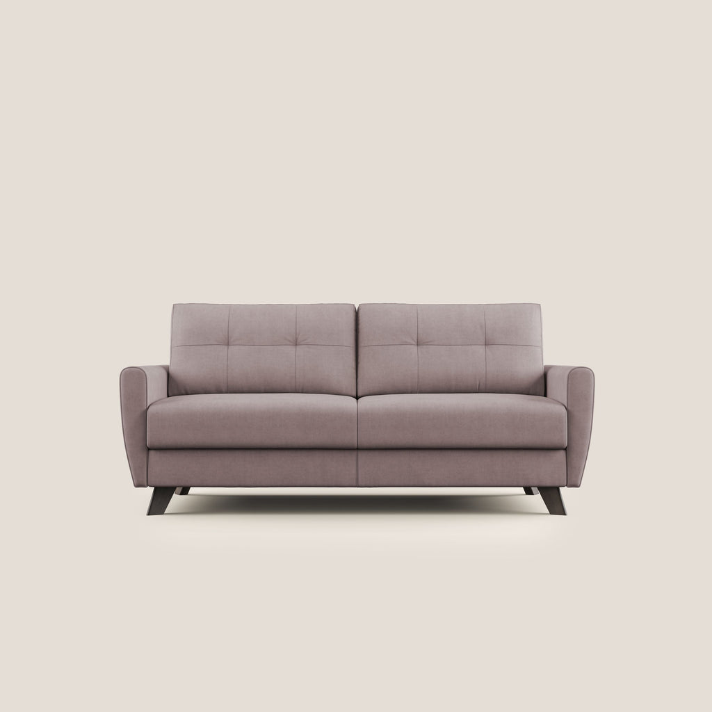 Le canapé-lit se distingue par ses lignes douces et confortables et par le dossier rembourré fabriqué à la main en Italie, qui représente une interprétation moderne du canapé capitonné classique. Les pieds en bois s'adaptent parfaitement à un style scandinave et shabby. Le mécanisme de mouvement de pliage offre un plan de couchage en grillage électro-soudé, mais peut également être réalisé avec un plan de couchage à lattes en hêtre. Les deux options sont équipées d'extrémités de sangles élastiques qui, une fois le canapé fermé, se retrouvent dans la partie située sous l'assise, le rendant plus doux et plus accueillant. Le canapé est fabriqué dans un tissu doux, imperméable et résistant aux taches, ce qui facilite le nettoyage. Le traitement déperlant permet un entretien rapide et précis du produit, avec notamment la possibilité de le laver en machine à 30°.