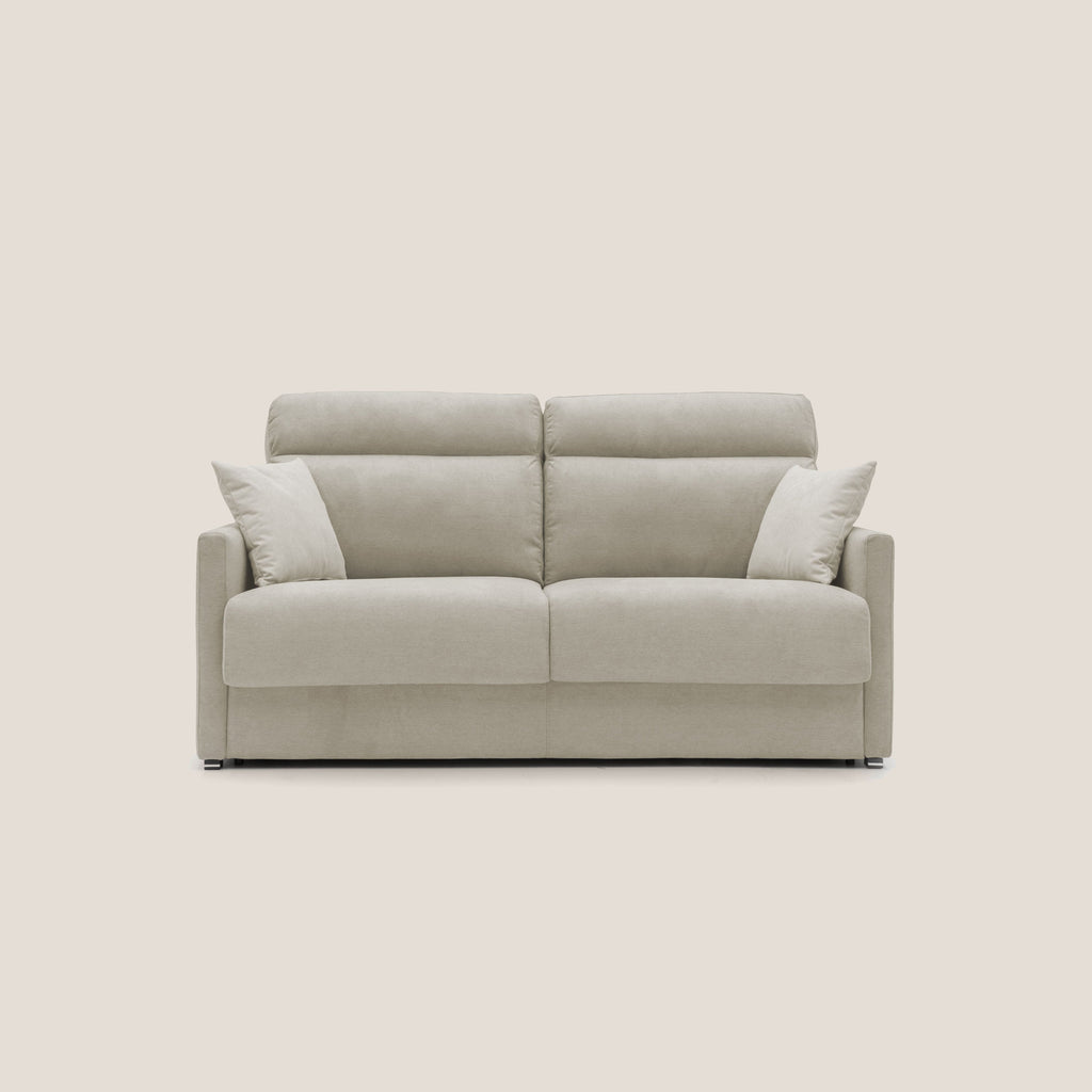 Le canapé-lit se caractérise par un dossier haut en flocage doux qui garantit un grand confort, parfait également pour reposer la tête. Fabriqué en tissu doux et imperméable, il est disponible en version 3 places et 2 places. Les pieds en bois wengé et le profil chromé donnent une touche d'élégance. Le canapé est disponible en 12 couleurs et différentes tailles, s'adaptant ainsi à chaque besoin d'espace et de design.