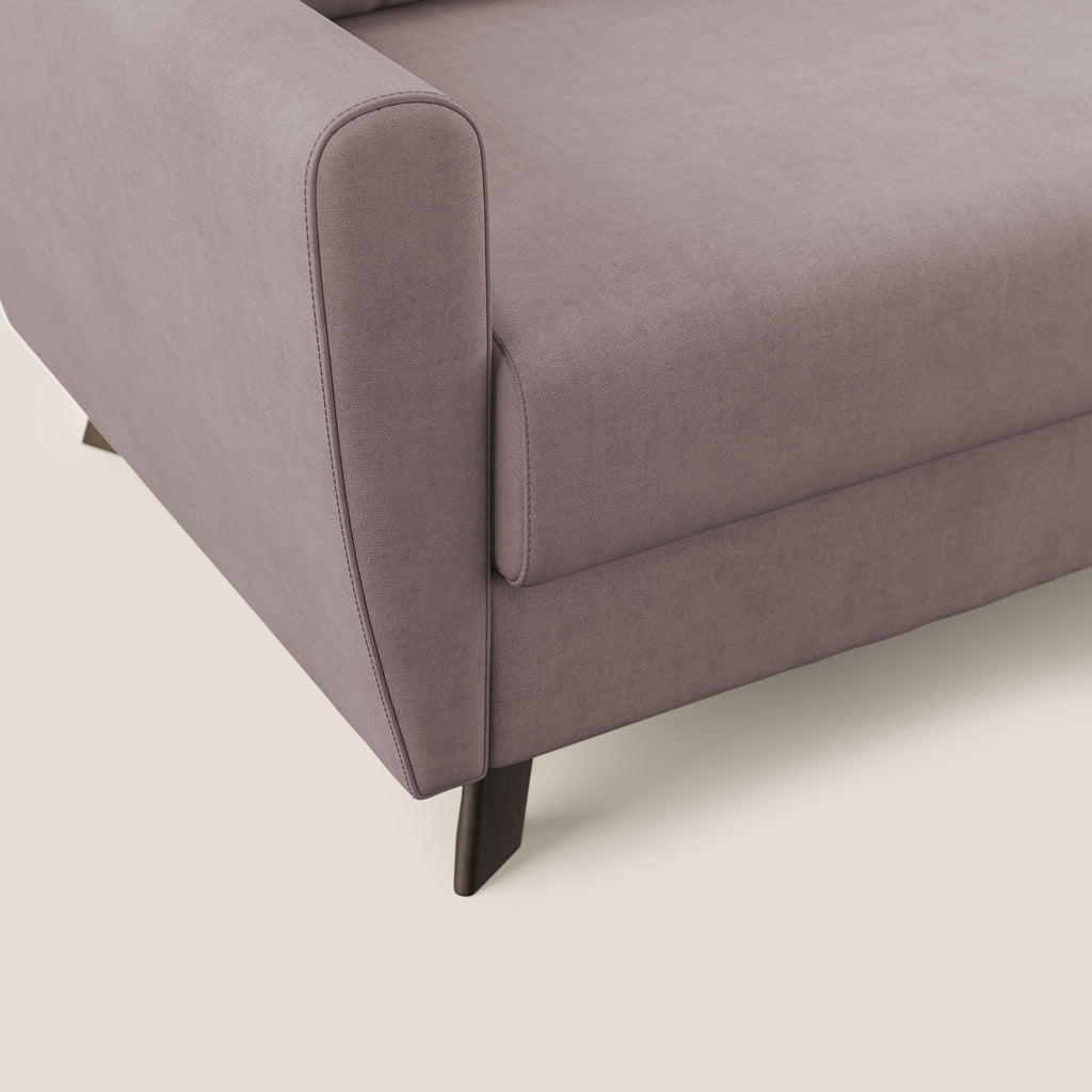 Le canapé-lit se distingue par ses lignes douces et confortables, avec un dossier rembourré fabriqué à la main en Italie. Ce canapé représente une interprétation moderne du canapé capitonné classique. Les pieds en bois s'adaptent parfaitement à un style scandinave et shabby. Le mécanisme de pliage du canapé comprend un plan de couchage en grillage électro-soudé, mais il peut également être réalisé avec un plan de couchage à lattes en hêtre. Les deux options ont une extrémité en sangle élastique qui rend l'assise plus douce et plus accueillante lorsque le canapé est fermé. Le tissu du canapé est doux, imperméable et résistant aux taches, ce qui facilite le nettoyage. De plus, le traitement déperlant permet de laver le canapé en machine à 30° pour un entretien rapide et minutieux.