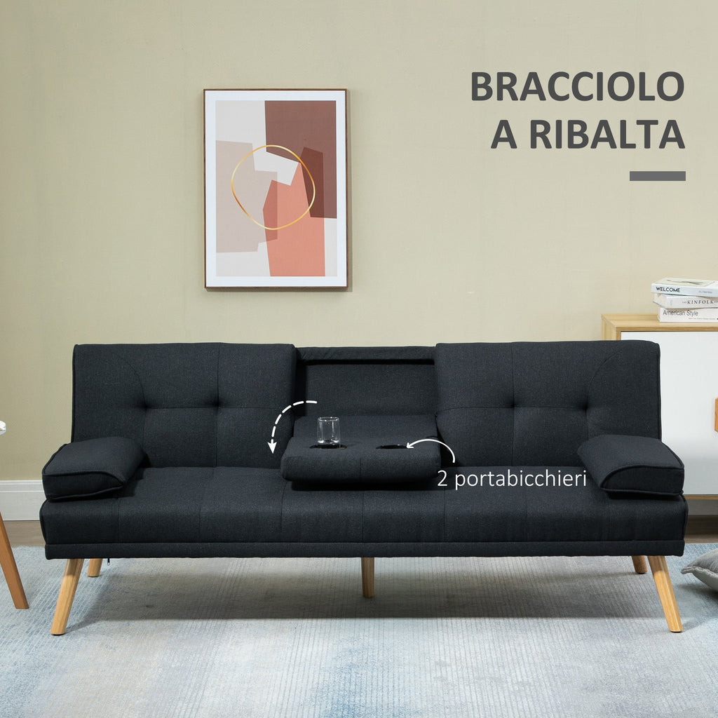Divano da salotto con seduta extra large per tre persone. Imbottitura spessa su seduta e schienale per un comfort continuo tutto il giorno. Esclusivo meccanismo del divano clic clac che permette di passare rapidamente e facilmente da divano 3 posti a divano letto. Rivestimento in tessuto effetto lino con gambe in legno pioppo che supportano fino a 250 kg di peso. Portabicchieri incluso. Braccioli rimovibili e utilizzabili come cuscini. Piedini antiscivolo che proteggono il pavimento dai graffi. Montaggio richiesto.