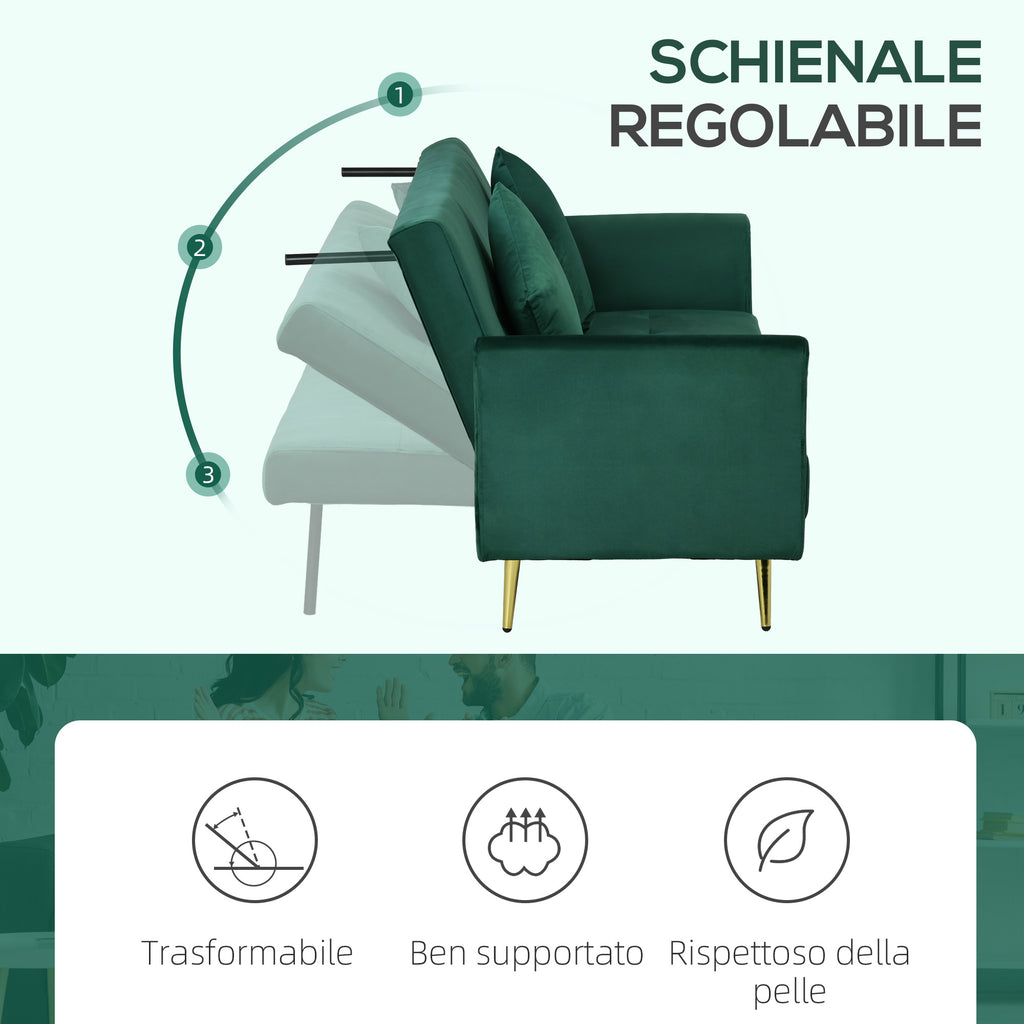Divano Letto Singolo Clic Clac con Schienale Regolabile 215x83x87 cm in Tessuto Effetto Velluto con 2 Cuscini Verde