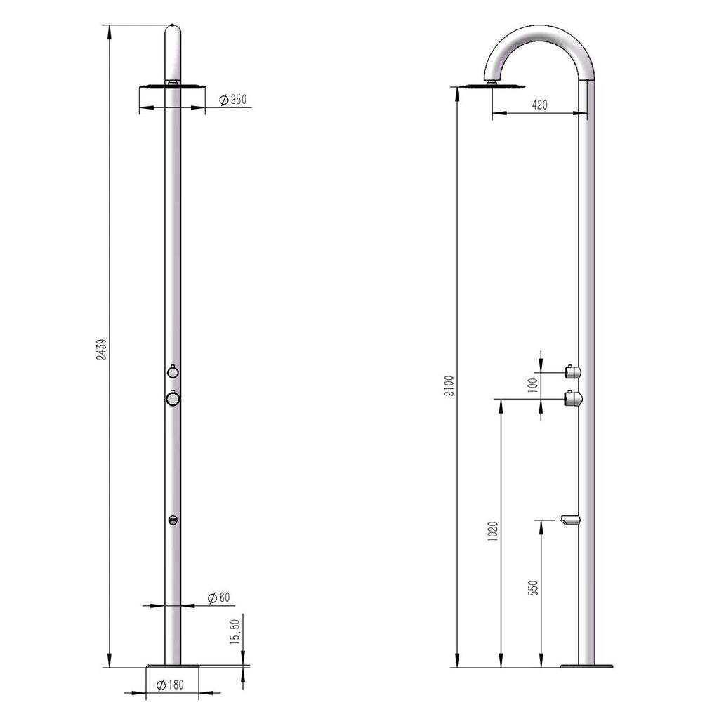La douche de piscine de haute qualité a été conçue et construite pour toute installation extérieure. La douche modèle PALAU avec lave-pieds est une douche en acier satiné Aisi Inox 316 avec entrée d'eau chaude et froide. La douche extérieure est excellente pour un usage commercial et privé, pour les piscines extérieures-intérieures, les jardins ou pour la salle de bain à domicile. Hauteur 2439mm. diamètre 60mm.