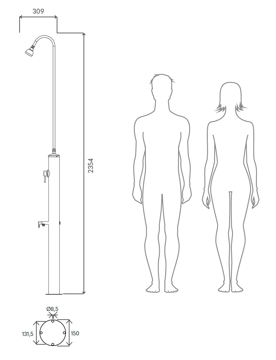L'armonia e l'eleganza delle sue forme la rendono un complemento d'arredo adatto per qualsiasi ambientazione, sia solo per il giardino o se necessitate di una doccia per la vostra piscina. Ideale per strutture pubbliche e balneari.