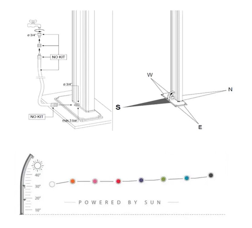 La doccia solare è progettata per essere utilizzata in condizioni di alimentazione idrica normale con una pressione inferiore a 3 bars (3 kg).