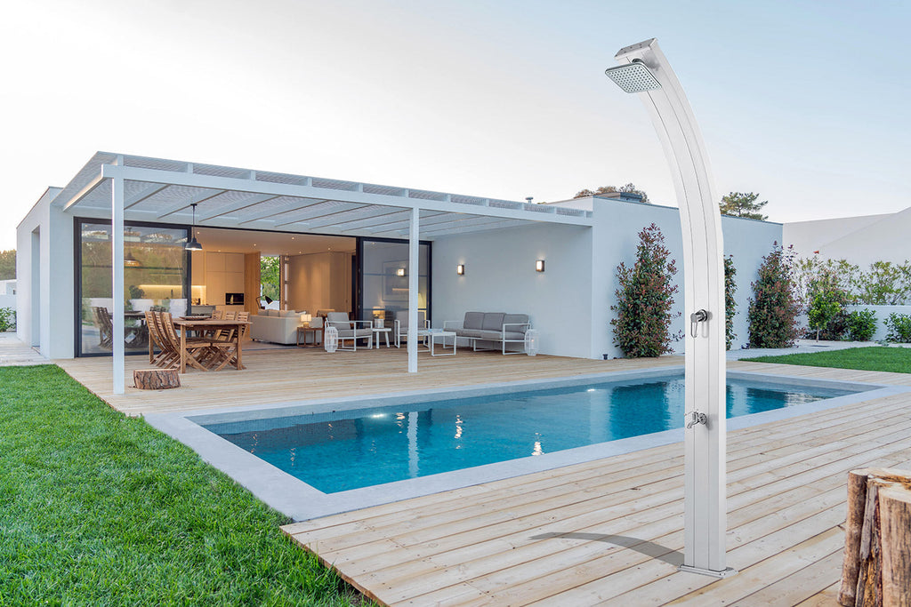 Le design contemporain de cette douche solaire s'intègre parfaitement dans n'importe quel jardin ou terrasse. Conçu entièrement en aluminium et/ou en acier inoxydable. La chaleur solaire est suffisante pour chauffer son grand réservoir de 30 litres, il est donc 100% écologique. Son design incurvé, son élégance et sa légèreté rendent cette douche indispensable pour tous les environnements extérieurs. Connectez-le simplement à une source d'eau.