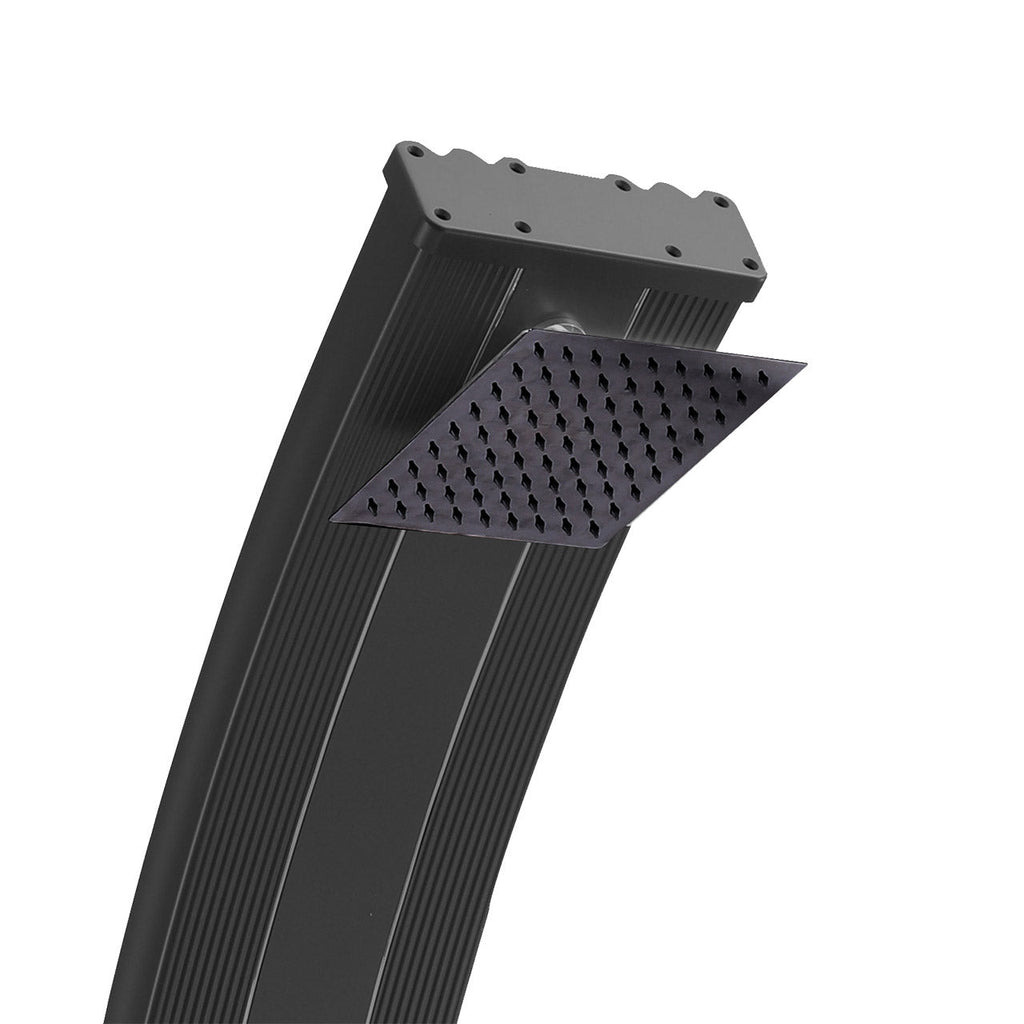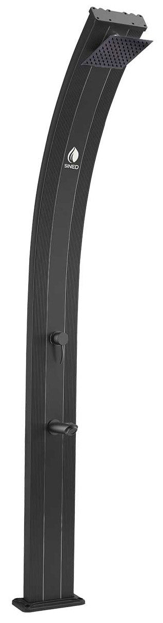 Douche extérieure chauffée solaire Sined Lea de couleur noire Douche avec structure en aluminium incurvée et grand réservoir de 30 litres Douche de 225,4 cm de haut équipée d'une grande pomme de douche carrée, d'un mitigeur et d'un robinet lave-pieds.