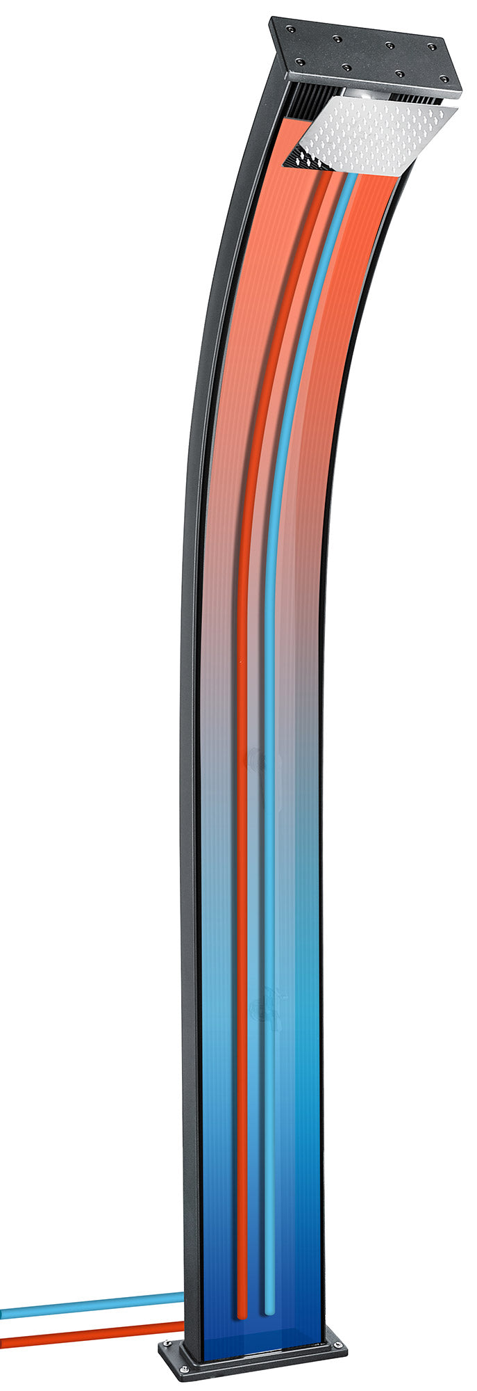 Cette douche associe la technologie solaire écologique et est équipée d'un réservoir d'une capacité de 37L, équipé d'un raccordement eau chaude, pour garantir une douche à température contrôlée quel que soit le nombre d'utilisateurs. Comprend un rince-pieds, Idéal près d'une piscine. Il est également équipé d'un raccordement eau chaude pour le réseau domestique. Vous profitez ainsi à la fois d'une eau chaude chauffée à 100% par l'énergie solaire, mais aussi d'une eau chaude provenant de votre propre réseau d'eau si nécessaire.