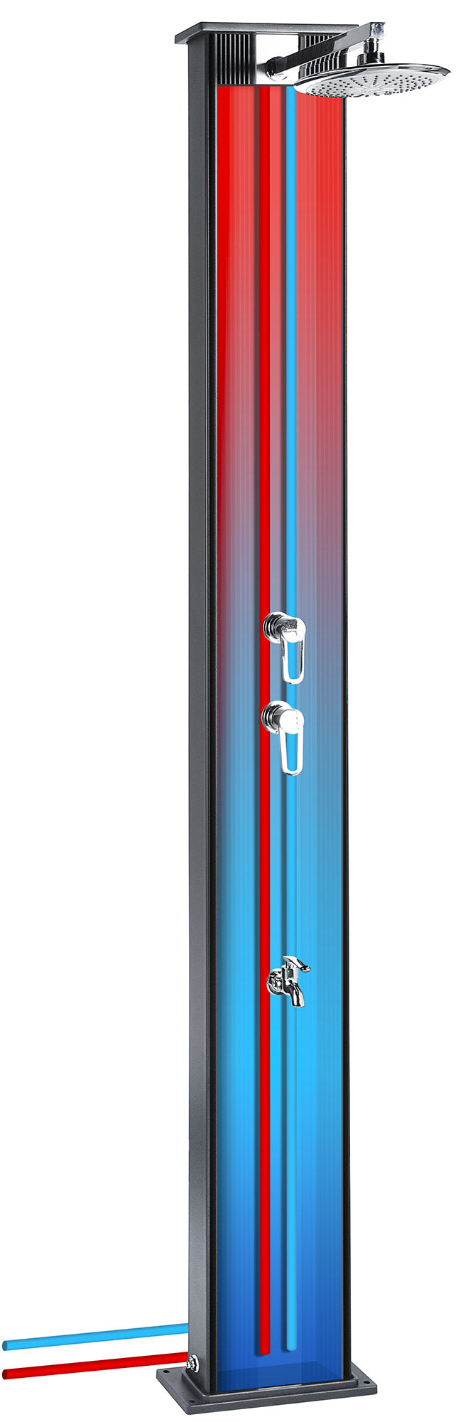 Cette douche associe la technologie solaire écologique et est équipée d'un réservoir d'une capacité de 37L, équipé d'un raccordement eau chaude, pour garantir une douche à température contrôlée quel que soit le nombre d'utilisateurs. Comprend un rince-pieds, Idéal près d'une piscine. Il est également équipé d'un raccordement eau chaude pour le réseau domestique. Vous profitez ainsi à la fois d'une eau chaude chauffée à 100% par l'énergie solaire, mais aussi d'une eau chaude provenant de votre propre réseau d'eau si nécessaire.