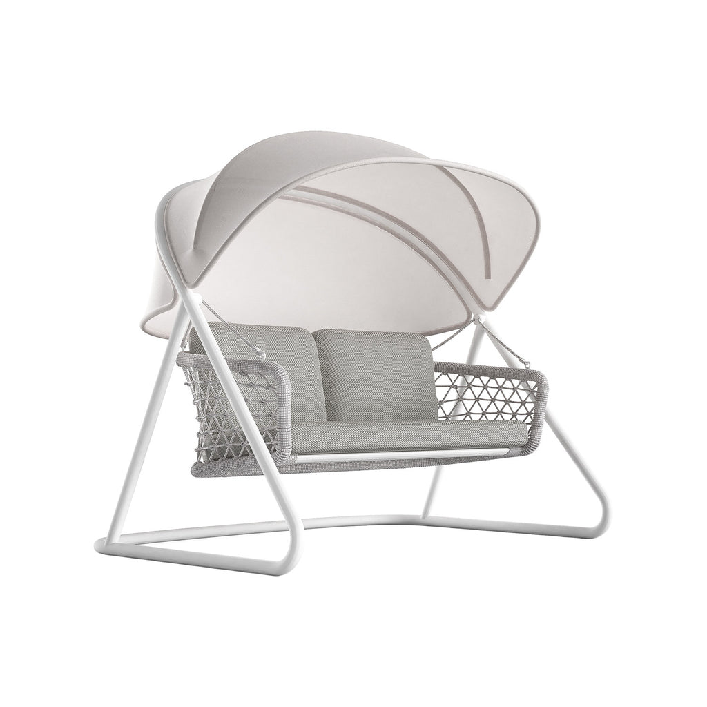 Imaginez une balançoire deux places avec une structure en aluminium au design élégant et une finition blanc mat. Les coussins, recouverts d'oléfine à la texture douce et résistante, offrent confort et style, tandis que le tissu du toit crée une atmosphère accueillante. Avec une empreinte équilibrée, cette balançoire est l'endroit idéal pour se détendre, avec un siège spacieux et un dossier haut pour un confort maximal.