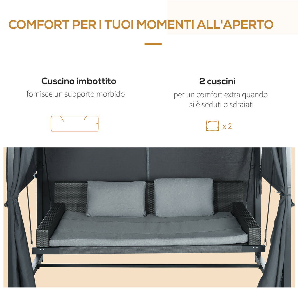 Rilassati con stile su questo originale dondolo da giardino 3 in 1. Puoi dondolarti, fare un sonnellino e restare al riparo dal sole grazie alla pergola dotata di tettuccio e tende laterali. La struttura in acciaio rinforzato dona stabilità e resistenza, mentre le finiture in rattan PE del dondolo creano un effetto elegante che arricchisce di stile il tuo giardino. Goditi le belle giornate in totale privacy e comodità!