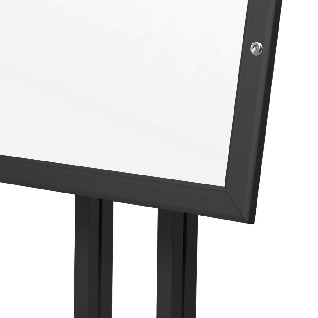 L'espositore a leggio per esterni è realizzato in alluminio autoportante, con una base solida e doppio montante di dimensioni 55x25 mm. La sua elegante finitura nera, ottenuta mediante verniciatura a polveri, lo rende adatto ad ogni tipo di ambiente. Il fondo del leggio è magnetico e scrivibile, ideale per fissare e annotare fogli o appunti. L'anta in policarbonato trasparente consente una visibilità ottimale dei contenuti esposti. Inoltre, l'espositore è dotato di un'apertura a libro con doppia serratura e chiavi in dotazione, garantendo un elevato livello di sicurezza. Il pannello di intestazione può essere personalizzato con il logo o essere completamente removibile. Le dimensioni della cornice sono 51,4x79 cm, mentre quelle della struttura sono 51x163 cm.