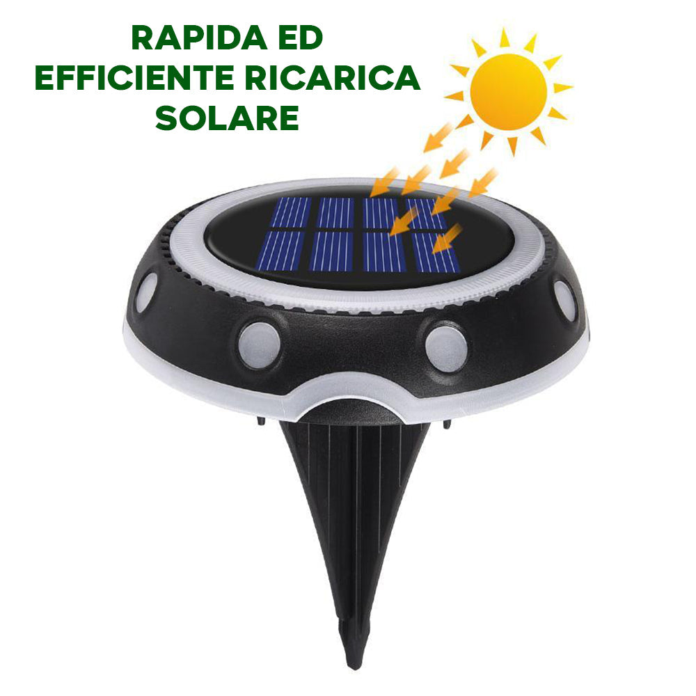 Ce projecteur ne nécessite aucun câblage, ne consomme pas d'électricité, ne prend que quelques secondes à installer sans aucun outil et peut être utilisé en toute sécurité autour des enfants et des animaux domestiques. Les batteries sont entièrement rechargées en 6 à 8 heures d'exposition à la lumière et fournissent un éclairage pendant 8 à 12 heures. La coque des lampes est en ABS avec degré de protection IP68, elles sont donc imperméables à la pluie et aux agents atmosphériques. L'interrupteur est situé à l'arrière des lumières et est recouvert de silicone résistant à l'humidité.