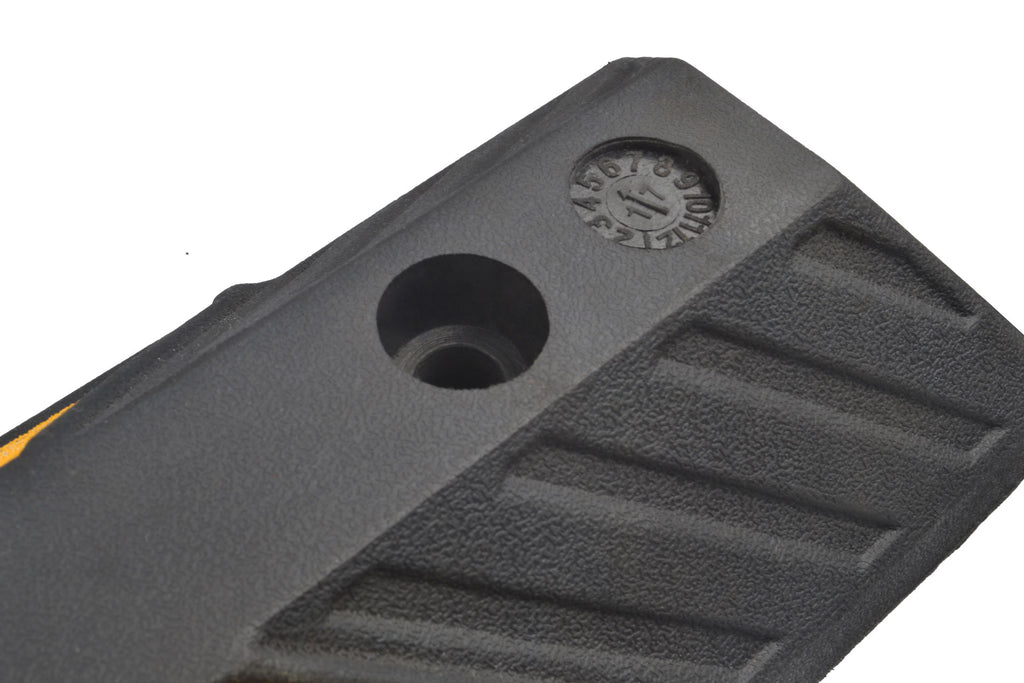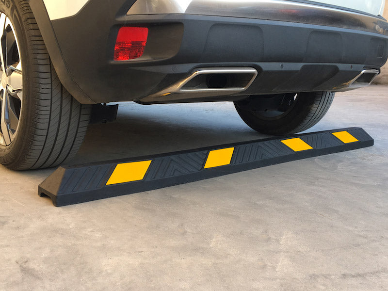 Butées de roue en caoutchouc vulcanisé équipées de poignées aux extrémités pour faciliter le transport et l'installation. Idéal pour les espaces privés fermés aux transports en commun.