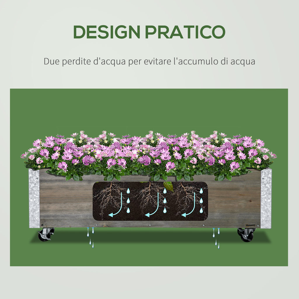 Questa elegante fioriera rettangolare in abete grigio è ideale per coltivare verdure, erbe aromatiche o fiori. Dal design compatto ed elegante, si adatta perfettamente a balconi, terrazze, patii o giardini. Dotata di 4 ruote, sistemi di irrigazione e un tessuto drenante, questa fioriera da da esterno è essenziale per ogni appassionato di giardinaggio! Fioriera rettangolare in legno di abete grigio, ideale per aggiungere un tocco di originalità ed eleganza al tuo spazio esterno. È dotata di ruote, per facilitare gli spostamenti e garantire una stabilità ottimale quando è ferma. Cassone per orto rialzato sufficientemente grande per coltivare diversi tipi di piante (ortaggi, piante aromatiche o fiori). Realizzata in legno di abete trattato, verniciato di grigio, e metallo, garantisce un utilizzo duraturo. Questa fioriera in legno per esterni è dotata di fori di drenaggio e di una rete geotessile nera che assicura una separazione ottimale del substrato e un buon drenaggio e ossigenazione del terreno. Montaggio facile e veloce grazie al manuale di istruzioni illustrato in dotazione.