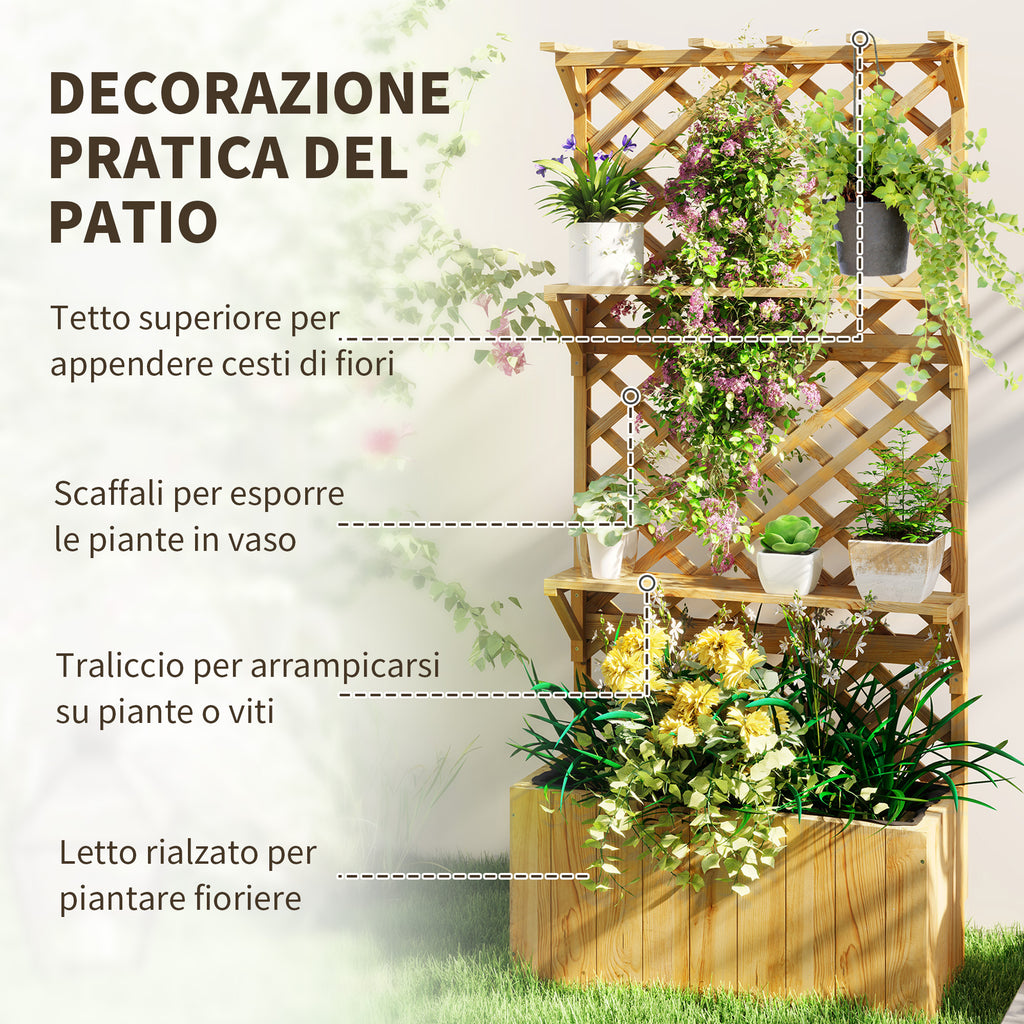Scopri tutti i vantaggi del orto rialzato da esterno con traliccio, una struttura ideale per piante e viti rampicanti con tetto per cesti e vasi sospesi. Le 2 mensole e i fori di drenaggio integrati per contrastare il ristagno d'acqua consente di avere piante sempre sane in un terreno fresco. Il supporto perfetto per ogni appassionato di giardinaggio! Letto per orto rialzato con traliccio per supportare piante rampicanti e viti. Fioriera da esterno con un piccolo tetto per appendere cesti, mentre 2 ripiani permettono di esporre dei vasi di fiori. I fori di drenaggio della fioriera con traliccio prevengono il ristagno d'acqua, proteggendo le piante dal marciume. Il rivestimento in tessuto non tessuto della fioriera in legno trattiene la terra e permette il drenaggio.