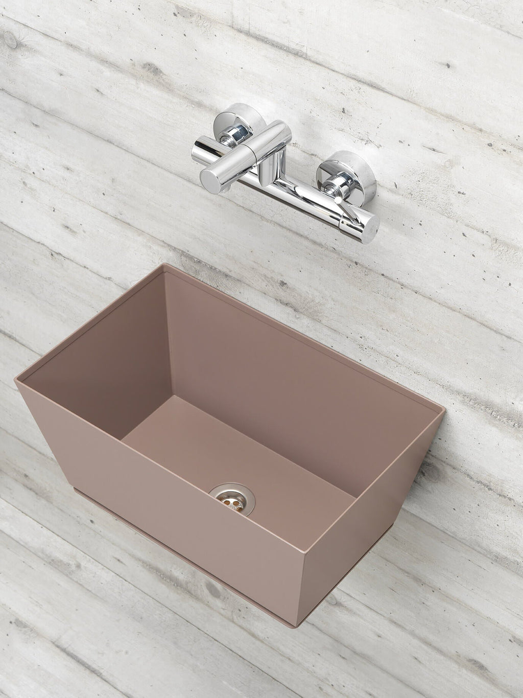 Fontana a parete da giardino dal design innovativo e originale, 42/PRQM con Miscelatore e Vasca Rettangolare della Belfer.