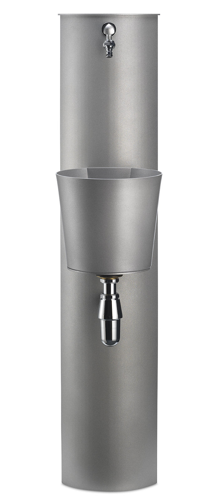 Fontaine murale de jardin au design innovant et original , 42/PRT avec Robinet et Seau de Belfer qui permet une installation avec des raccordements eau/évacuation à hauteurs variables : hauteur raccordement eau de 0 à 116cm, hauteur raccordement évacuation de 0 à 55cm.