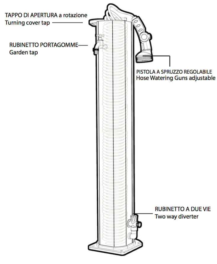 L'armonia e l'eleganza delle sue forme la rendono un complemento d'arredo adatto per qualsiasi ambientazione, sia solo per il giardino o se necessitate di una doccia per la vostra piscina. Ideale per strutture pubbliche e balneari.