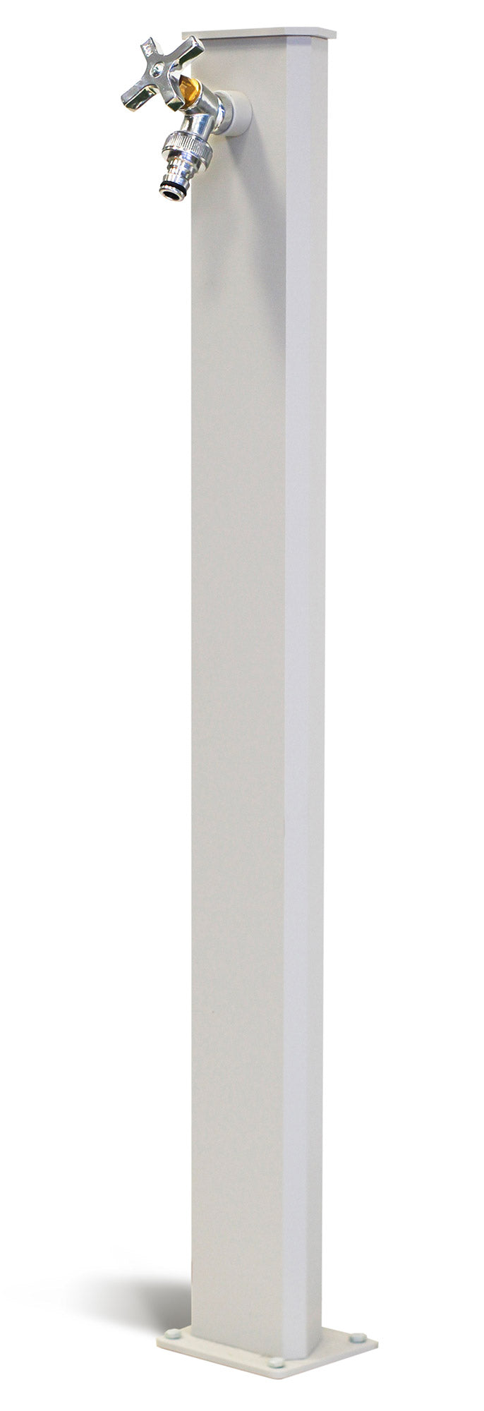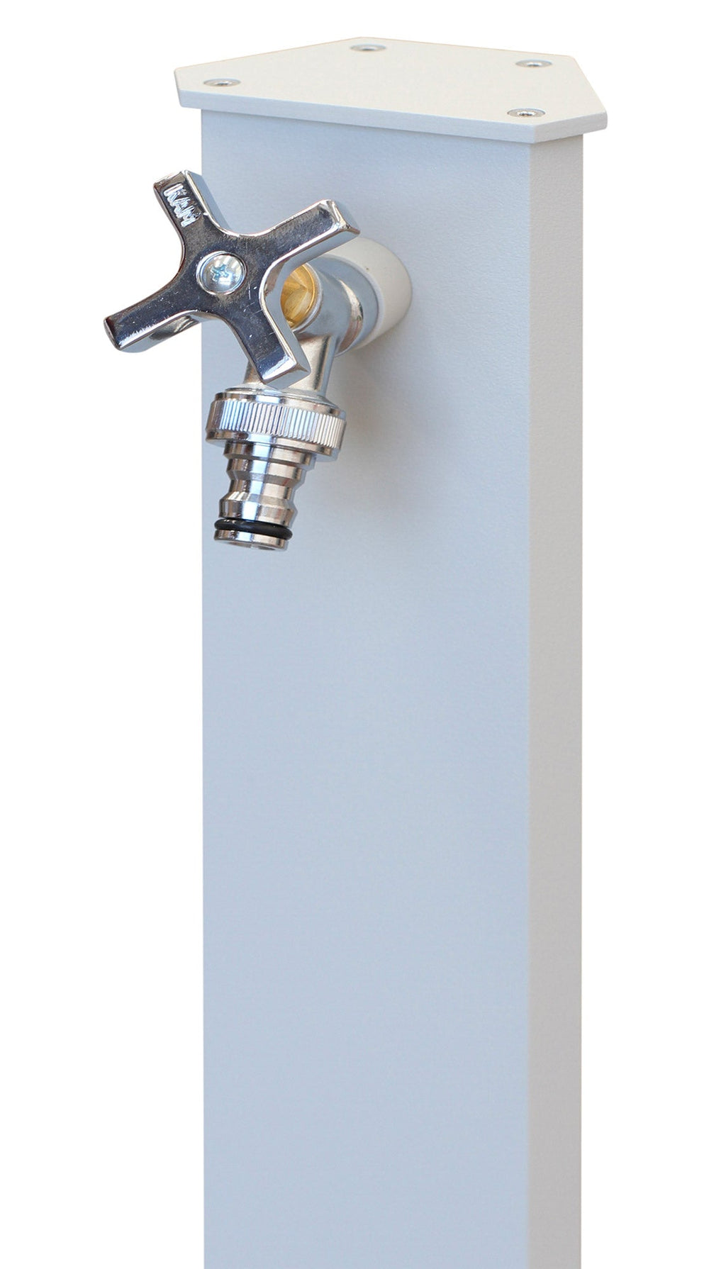 Fontana da giardino in acciaio-alluminio con trattamento antiruggine e verniciatura bianco grigiastro. Inclusi nel prezzo rubinetto in ottone cromato loggato e tubo in acciaio inox con dado da 1/2" F. Il tappo delle fontane è in acciaio zincato e verniciato a polveri epossidiche. L'assemblaggio viene effettuato in modo preciso: i fori sono svasati per evitare che le viti sporgano. Le viti sono tipo torx in acciaio inossidabile.