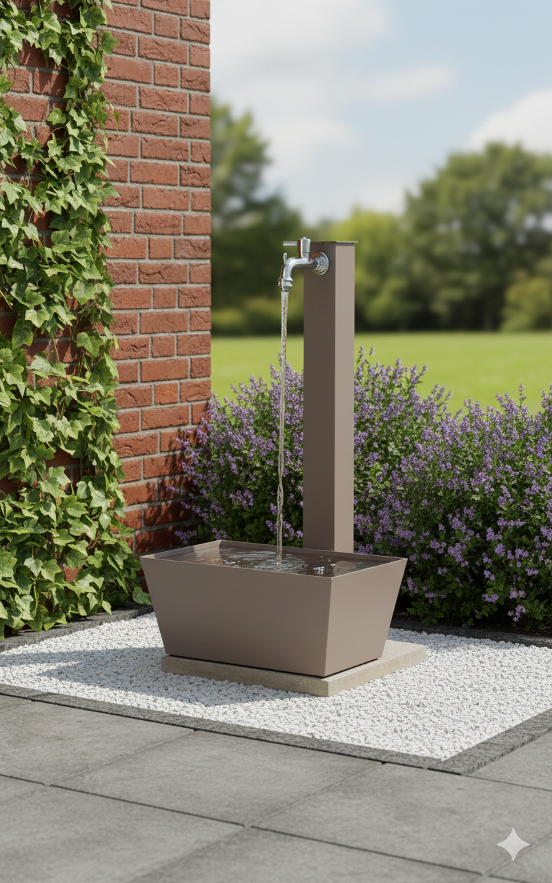 Fontaine de jardin au design innovant et original , 42/QVR avec grande vasque rectangulaire , socle en béton et robinet Belfer .
