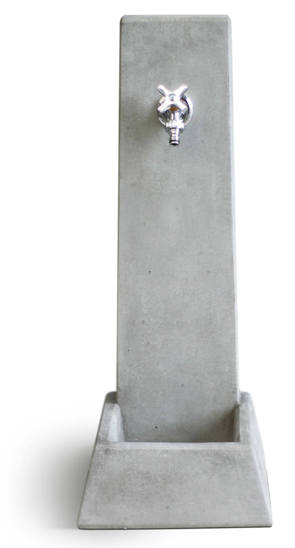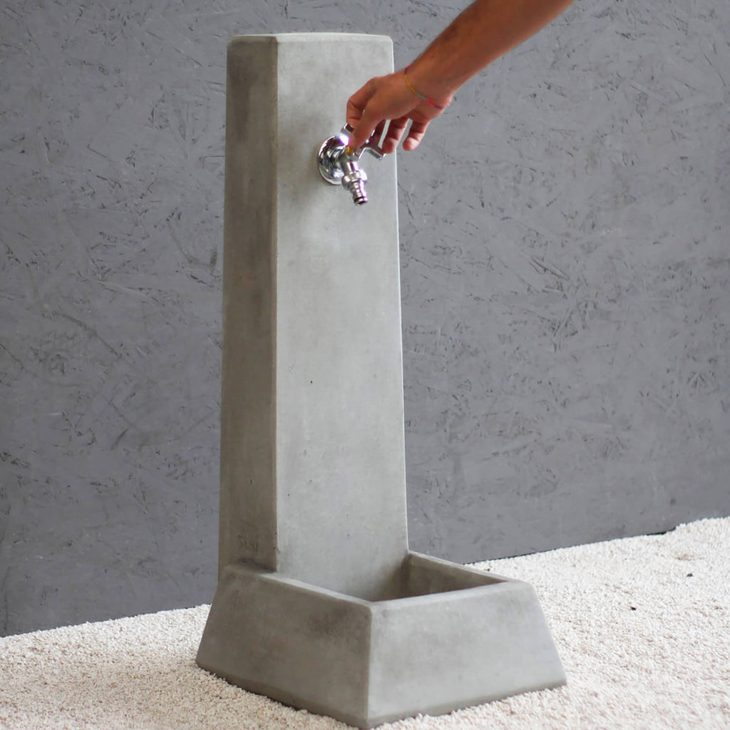 Fontana da giardino in cemento e granulato di marmo Il design della fontana Malmo è minimal e contemporaneo. Malmo è una fontana da giardino ispirata alle linee geometriche e semplici delle nuove abitazioni. Realizzata in cemento grigio e granuto di marmo. Le variazioni di colore e consistenza fanno parte delle caratteristiche naturali del calcestruzzo, e non hanno alcuna incidenza sull'integritè strutturale del prodotto, nè devono essere considerate come difetti del materiale, del design o della lavorazione. Infatti durante il processo di colata, l'aria resta intrappolata all'interno del calcestruzzo e può talvolta causare la formazione di piccoli fori superficiali, che possono variare in dimensioni e densitè. Questa caratteristica trama contraddistingue l'estetica del calcestruzzo. Il calcestruzzo per natura non ha una tinta uniforme, anche a causa del numero variabile di materiali di cui è composto. Le variazioni di tono e consistenza creano talvolta effetti e sfumature uniche che sono parte integrante della bellezza di questo materiale. All'interno della colonna è predisposta la tubazione da 1/2" che porta l'acqua al rubinetto. Alla fontana può essere abbinato qualunque rubinetto con attacco M 1/2". La fontana può essere posizionata direttamente sull'erba del giardino. Prodotto 100% Made in Italy