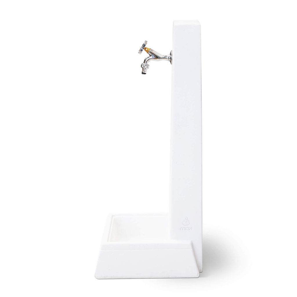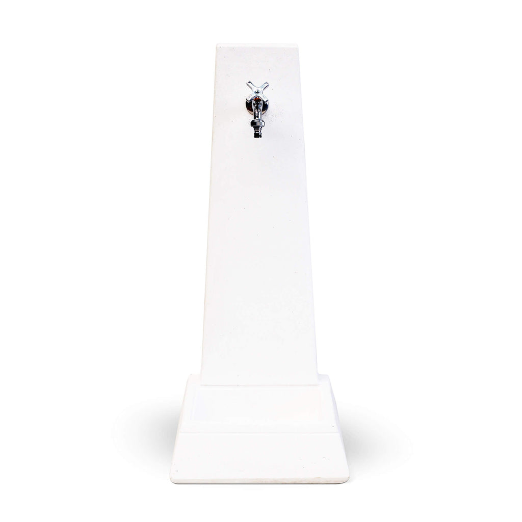 Fontana da Giardino. Il design della fontana Oslo è minimal e contemporaneo. Oslo è una fontana da giardino ispirata alle linee geometriche e semplici delle nuove abitazioni. Realizzata in cemento bianco e granuto di marmo. Le variazioni di colore e consistenza fanno parte delle caratteristiche naturali del calcestruzzo, e non hanno alcuna incidenza sull'integrità strutturale del prodotto, né devono essere considerate come difetti del materiale, del design o della lavorazione. Infatti durante il processo di colata, l'aria resta intrappolata all'interno del calcestruzzo e può talvolta causare la formazione di piccoli fori superficiali, che possono variare in dimensioni e densità. Questa caratteristica trama contraddistingue l'estetica del calcestruzzo. Il calcestruzzo per natura non ha una tinta uniforme, anche a causa del numero variabile di materiali di cui è composto. Le variazioni di tono e consistenza creano talvolta effetti e sfumature uniche che sono parte integrante della bellezza di questo materiale. All'interno della colonna è predisposta la tubazione da 1/2" che porta l'acqua al rubinetto. La fontana può essere posizionata direttamente sull'erba del giardino.