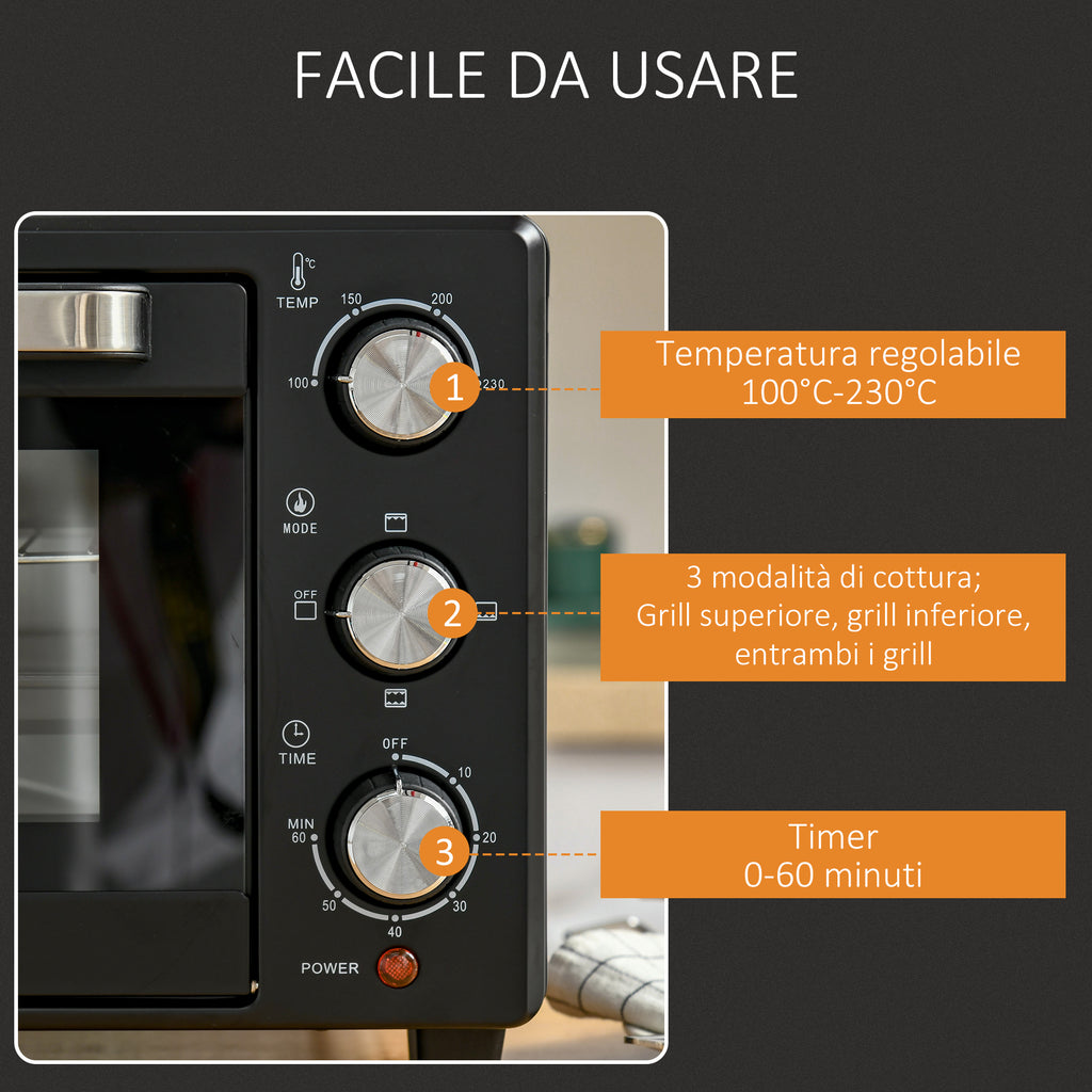 - CONCEPTION FONCTIONNELLE : avec ce four électrique, vous pouvez cuisiner avec 3 modes différents : chauffage uniquement sur la partie supérieure, uniquement sur la partie inférieure ou des deux côtés. La plaque de cuisson et la grille peuvent être réglées en hauteur sur 3 positions différentes et la porte vitrée vous permet de surveiller vos aliments pendant la cuisson.