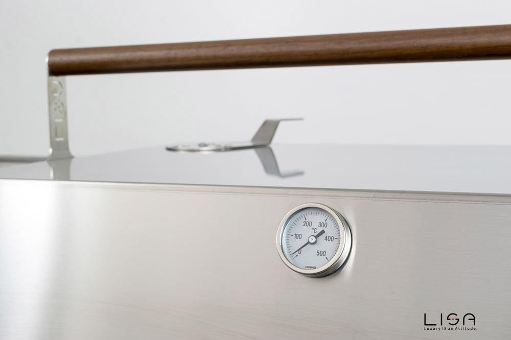 - Un couvercle, avec thermomètre intégré pour contrôler la température du four et une poignée agrémentée d'un élégant insert en bois de noyer Canaletto