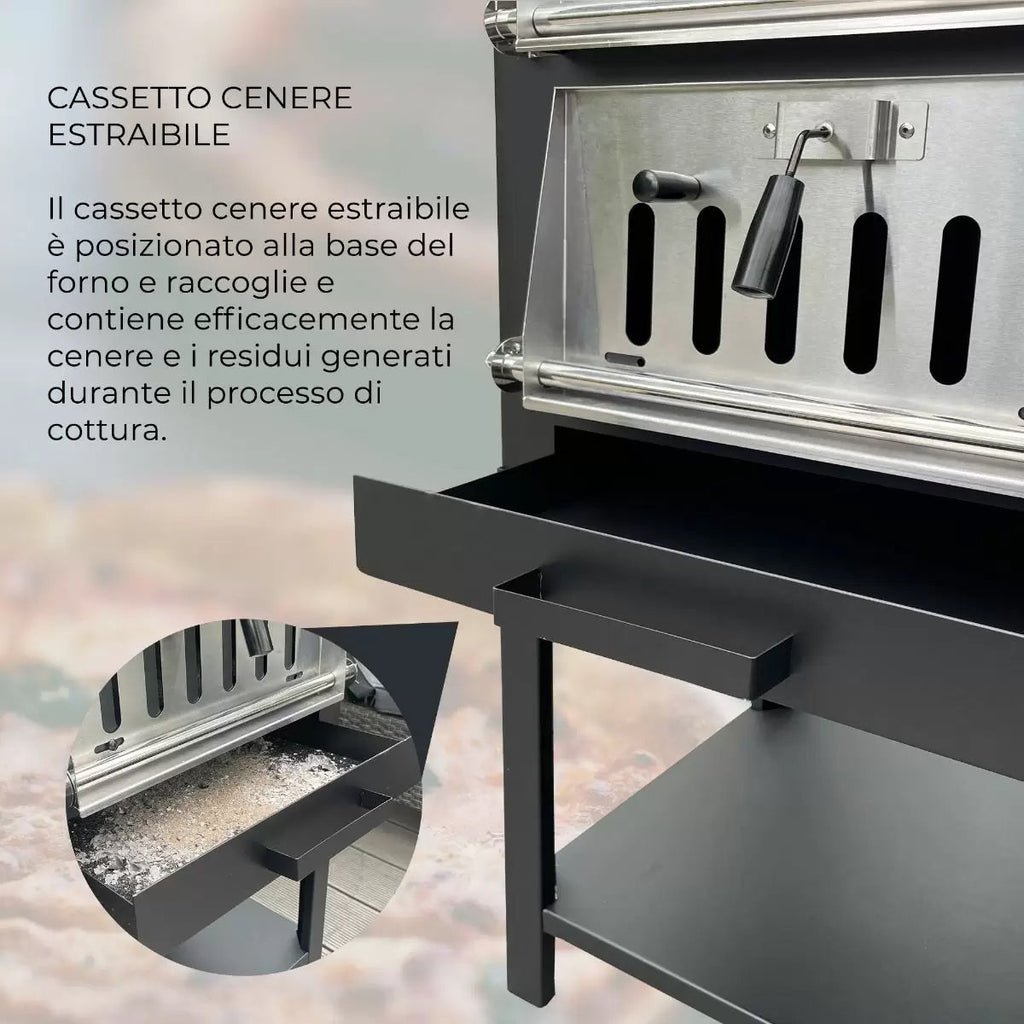 - Incluso ripiano per il combustile permette a questo forno di essere alimentato a carbone