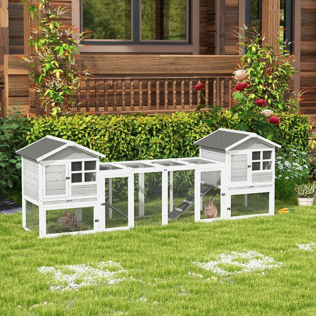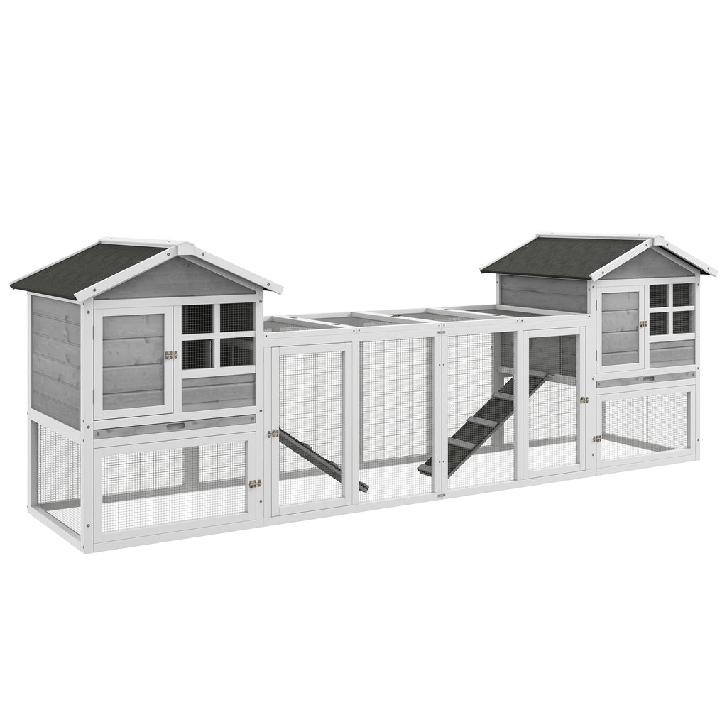 Gabbia per Conigli Conigliera 259x64x92 cm 2 Casette con Rampe Recintata in Legno Grigia
