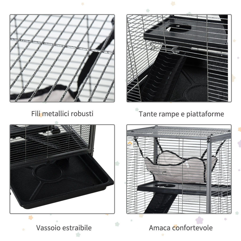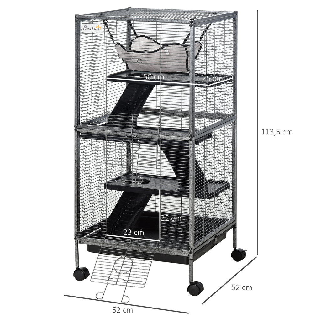 Cette cage est la maison idéale pour les rongeurs et les petits animaux. La structure est construite en métal et s'étend sur 3 étages, chacun relié entre eux par une rampe en plastique. Comprend un hamac que votre petit ami peut utiliser pour faire une sieste et un plateau amovible à la base. Grâce aux 4 roues vous pourrez le déplacer confortablement d'une pièce à l'autre, sans déranger son locataire.