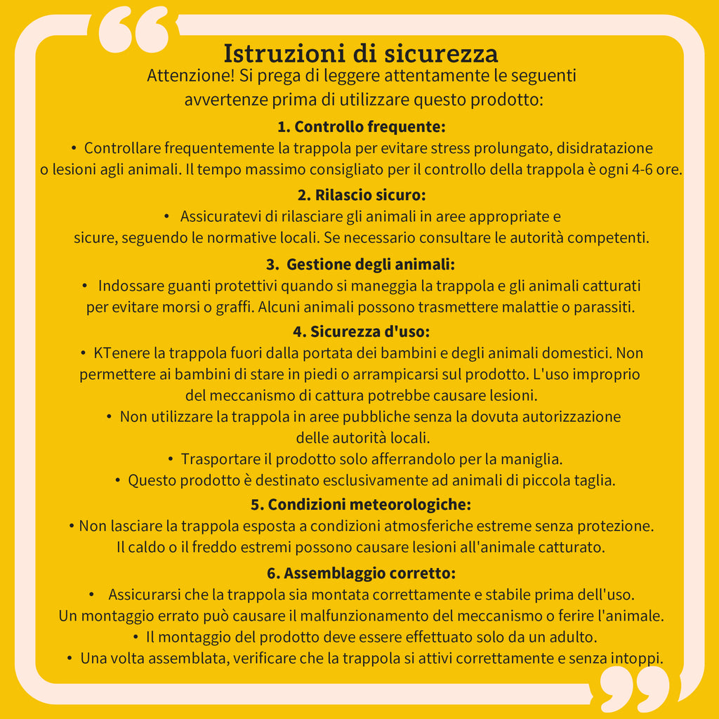 - FACILE DA UTILIZZARE: Posiziona la trappola sulla traiettoria dell'animale e carica l'esca all'interno della piastra di pressione, una volta riempita la piastra, la trappola scatta e la porta si abbassa a terra intrappolando l'animale.