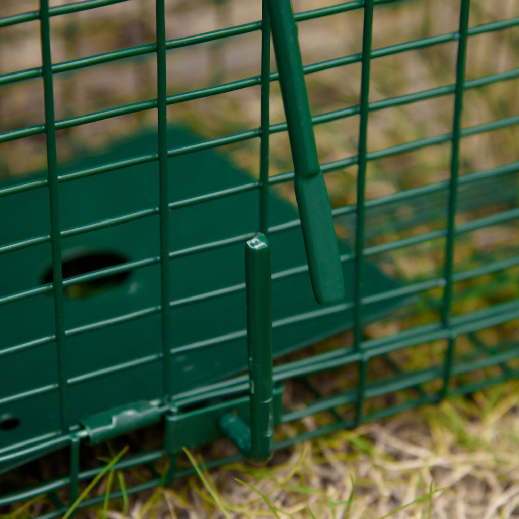 Cette cage piège à animaux a une conception à entrée unique et est équipée d'un mécanisme de verrouillage très sensible mais sûr pour piéger les animaux sans les blesser. Il peut être utilisé aussi bien en intérieur qu'en extérieur et est constitué de fils d'acier repeints. Facile à nettoyer et à sécher, sa couleur vert foncé est idéale pour se fondre dans la végétation.