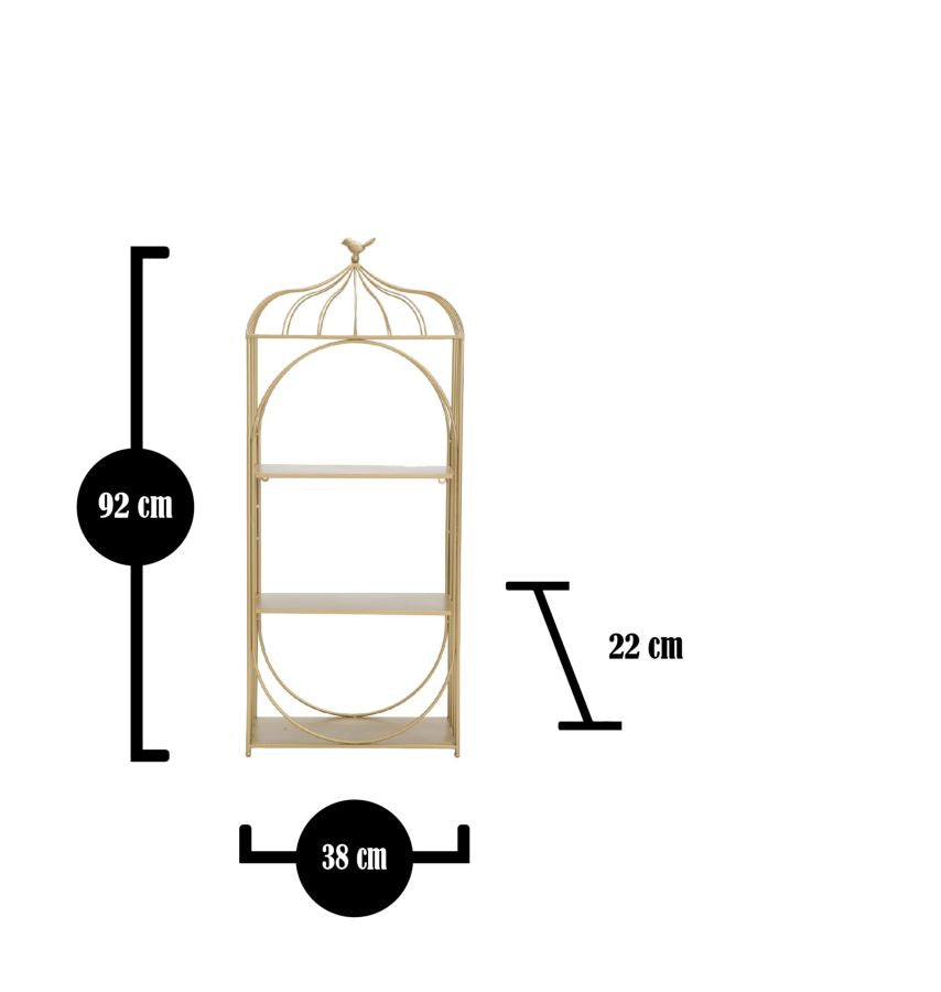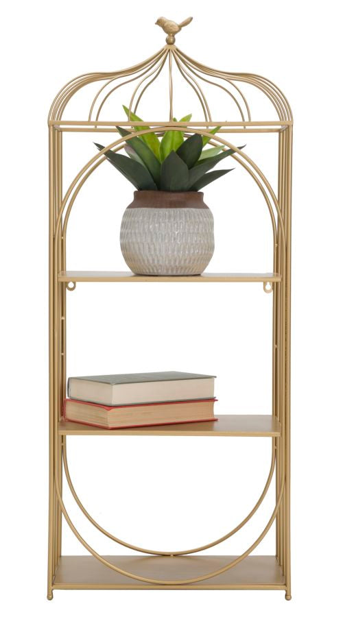Étagère murale particulière en métal doré avec 3 étagères au design rappelant une petite cage. Une touche spéciale pour ranger des objets.