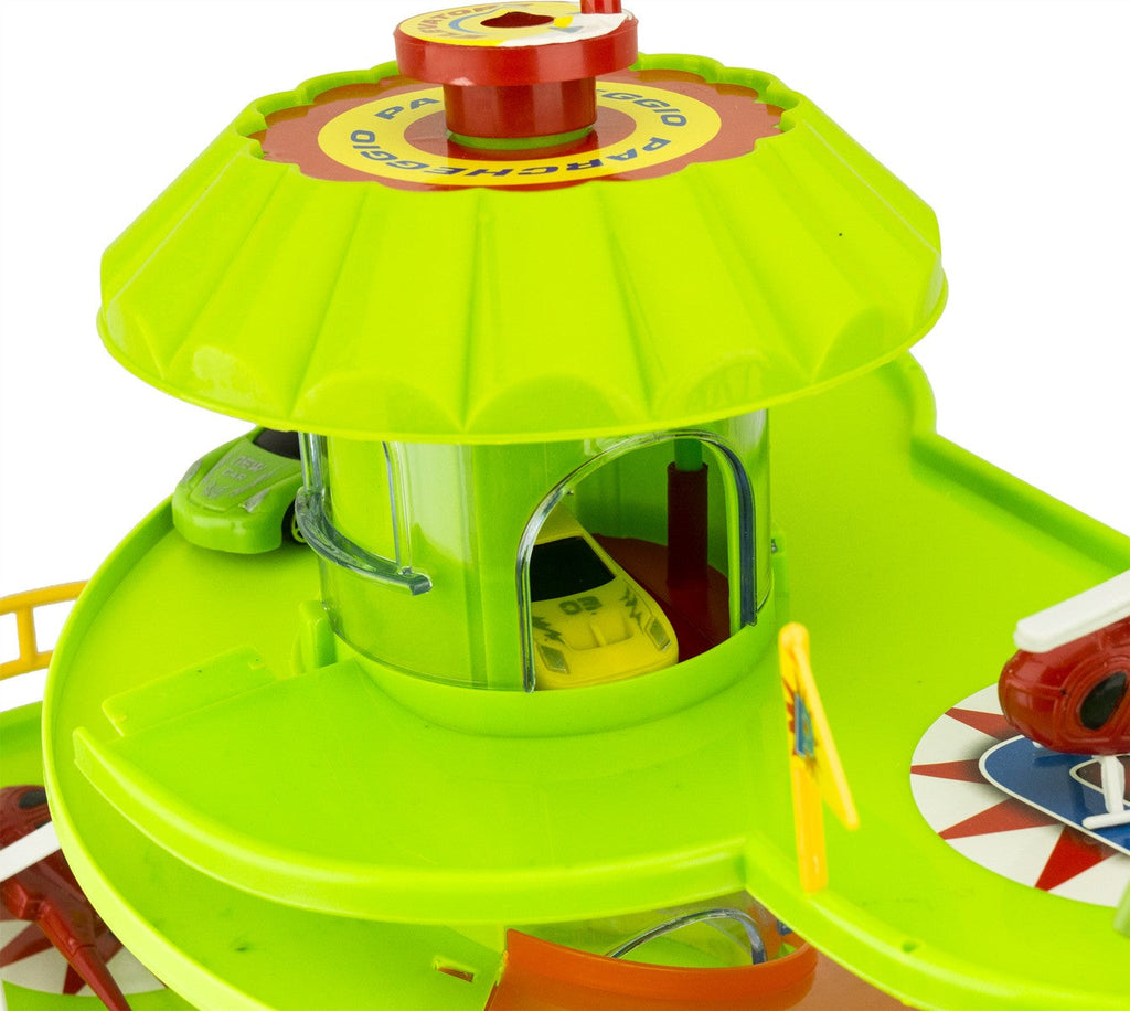 Garage à jouets pour enfants à plusieurs niveaux avec ascenseur pour voitures et hélicoptères