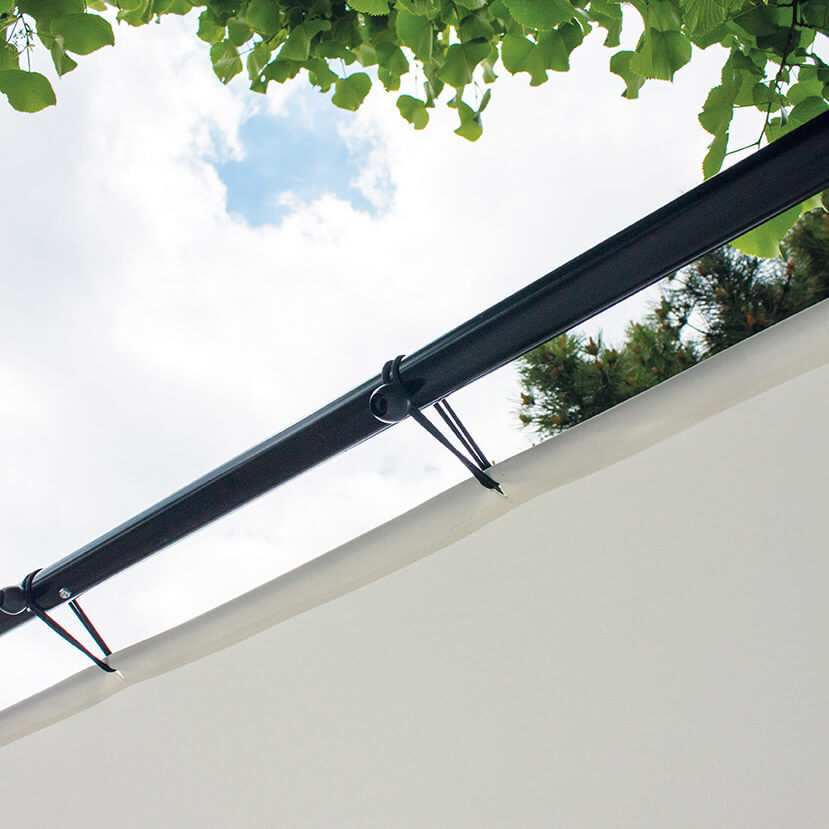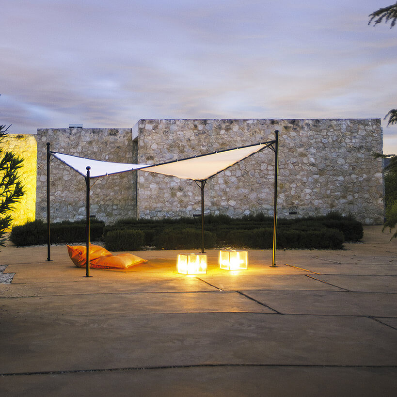 La voile représente la solution idéale qui combine l'amélioration esthétique et la fonctionnalité des espaces extérieurs. La structure avec des connecteurs en acier et les tendeurs de cordon résistants permettent une tension impeccable de la toile et une capacité à ombrager de grandes surfaces. La hauteur et la largeur de la surface concernée permettent de multiples usages, de la création de véritables espaces de détente au bord de la piscine ou dans le jardin, aux espaces destinés à la convivialité pour les banquets et aux buvettes meublées de fauteuils et canapés. Le design innovant mais sobre en forme de diamant rend ce produit harmonieux dans les environnements de style moderne et classique.