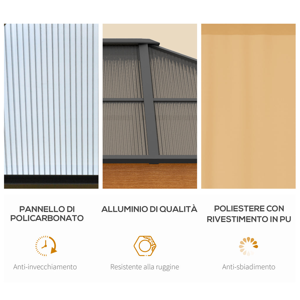Aggiungi un tocco elegante al tuo spazio esterno con questo gazebo , la soluzione per un perfetto riparo dal sole per ogni occasione! Il tetto in policarbonato protegge dai raggi UV, mentre la rete con cerniera rimovibile consente di staccare le tende per creare un ambiente aperto. Tu e i tuoi ospiti potrete rilassarvi all'ombra del tettuccio. La vita è pensata per essere vissuta all'aperto, quindi rilassati all'ombra grazie al tuo gazebo da giardino!