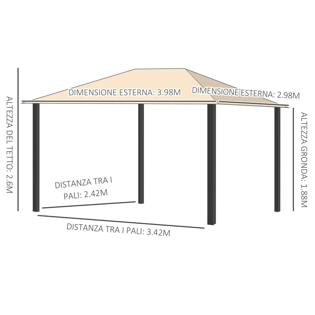 - DIMENSIONS : Dimensions hors tout : 3,98L x 2,98W x 2,6Am. Hauteur avant-toit : 1,88 m. Assemblage requis. Remarque : non recommandé pour une utilisation dans des conditions extrêmes telles que les tempêtes ou les vents violents/pluie.