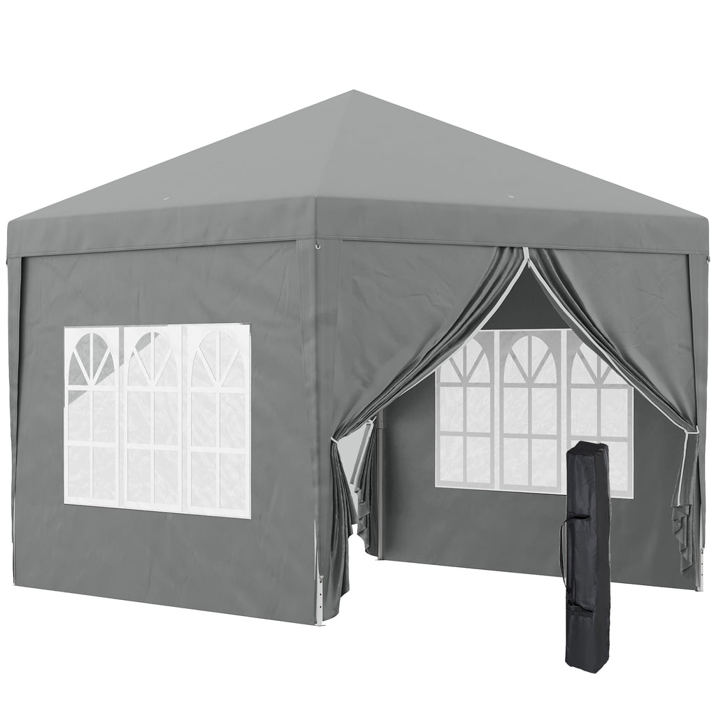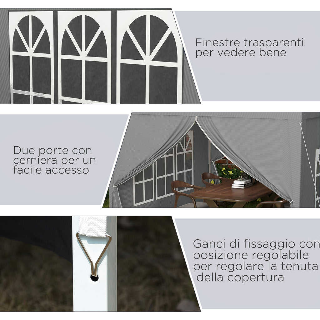 Il nostro gazebo da giardino pieghevole è l'alleato ideale per qualsiasi evento all'aria aperta. La struttura offre un'ombra fresca e un ambiente confortevole, mentre il telaio pieghevole permette di prepararlo o riporlo in poco tempo. Questo gazebo pieghevole è costruito in tubi d'acciaio rivestiti con una copertura impermeabile in tessuto Oxford resistente ai raggi UV. Inoltre, dispone di 4 pannelli laterali, di cui 2 con apertura con cerniera e 2 con finestre. Gazebo da giardino versatile ideale per eventi all'aperto o feste, con struttura pieghevole. Gazebo pieghevole realizzato in tessuto Oxford ad alta resistenza a raggi UV. Struttura robusta in tubi d'acciaio verniciati a polvere. Tendone per feste dotato di 4 pannelli laterali, di cui 2 con apertura con cerniera e 2 con finestre. La confezione include 4 corde e 8 picchetti per il fissaggio al terreno e una sacca per il trasporto. Facile da montare. Non esporre il gazebo da esterno a condizioni meteorologiche particolarmente avverse.